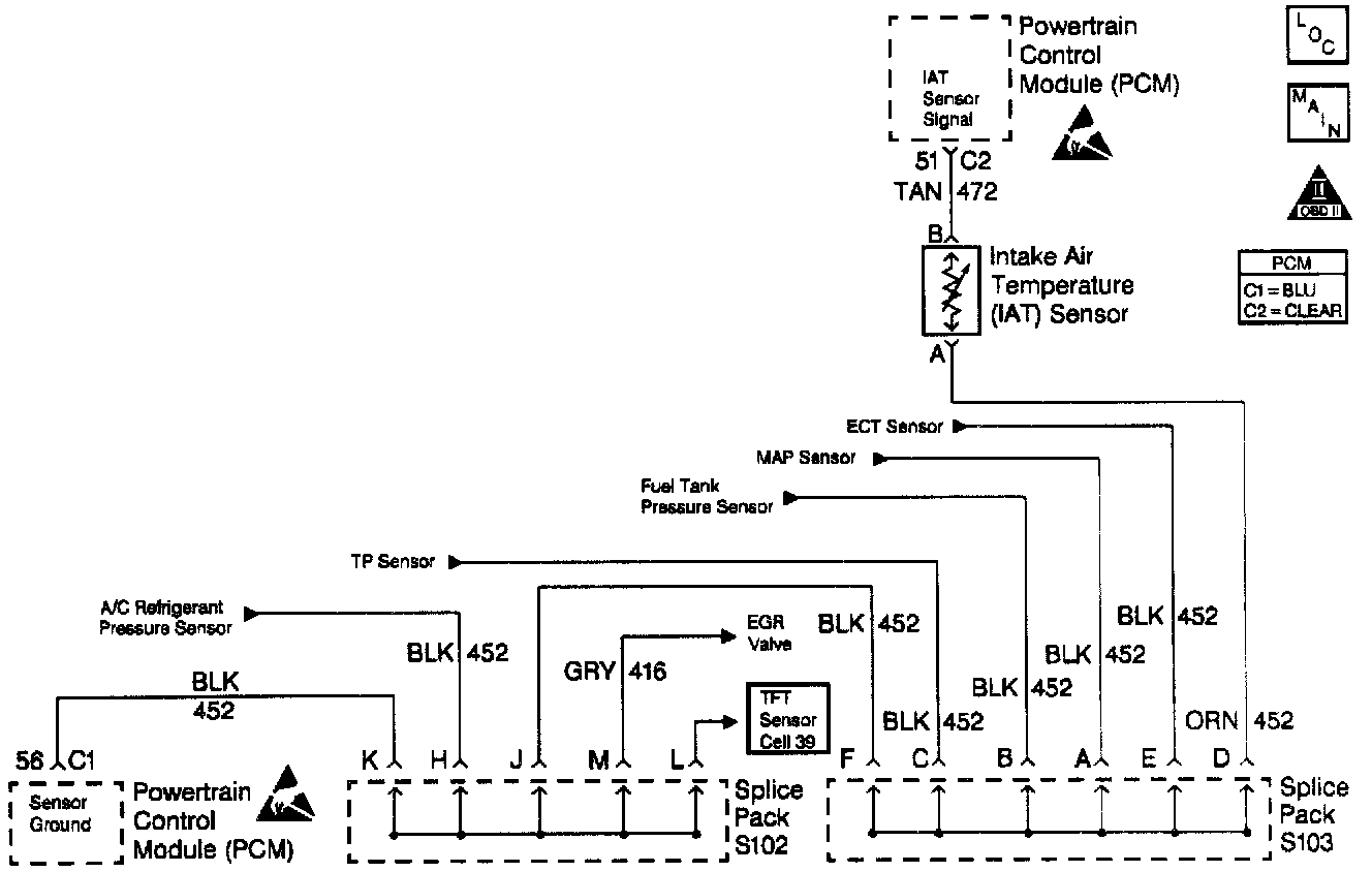 ^ Damaged harness. Inspect the wiring harness for damage. If the harness appears to be OK, observe the IAT display on the scan tool while moving connectors and wiring harnesses related to the IAT sensor. A change in the IAT display will indicate the location of the fault.