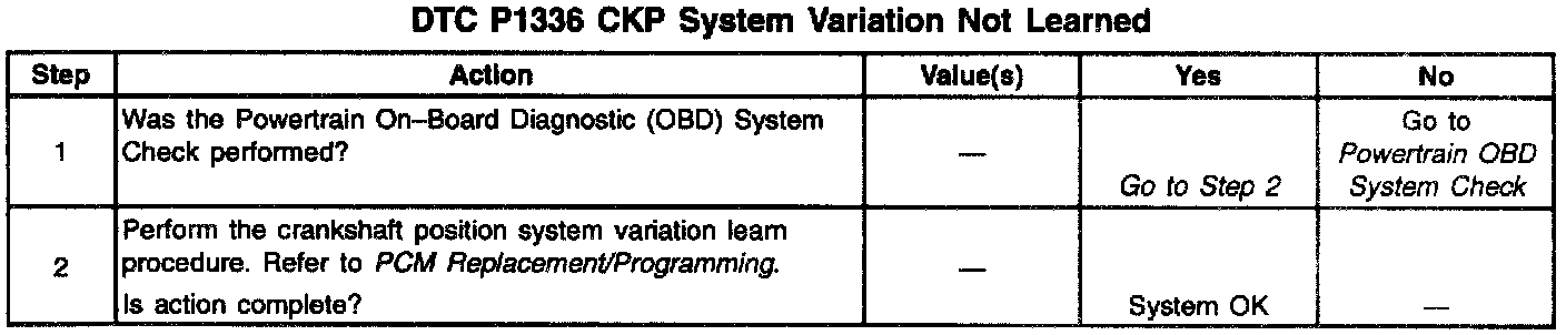 The crankshaft position system variation values are stored in the PCM non-volatile memory after the crankshaft position system variation learn procedure has been performed. DTC P1336 set indicates that the crankshaft position system variation values have not been stored in the PCM and the crankshaft position system variation learn procedure must be performed. The learn procedure is required after the following service procedures have been performed, regardless of whether or not DTC P1336 is set: