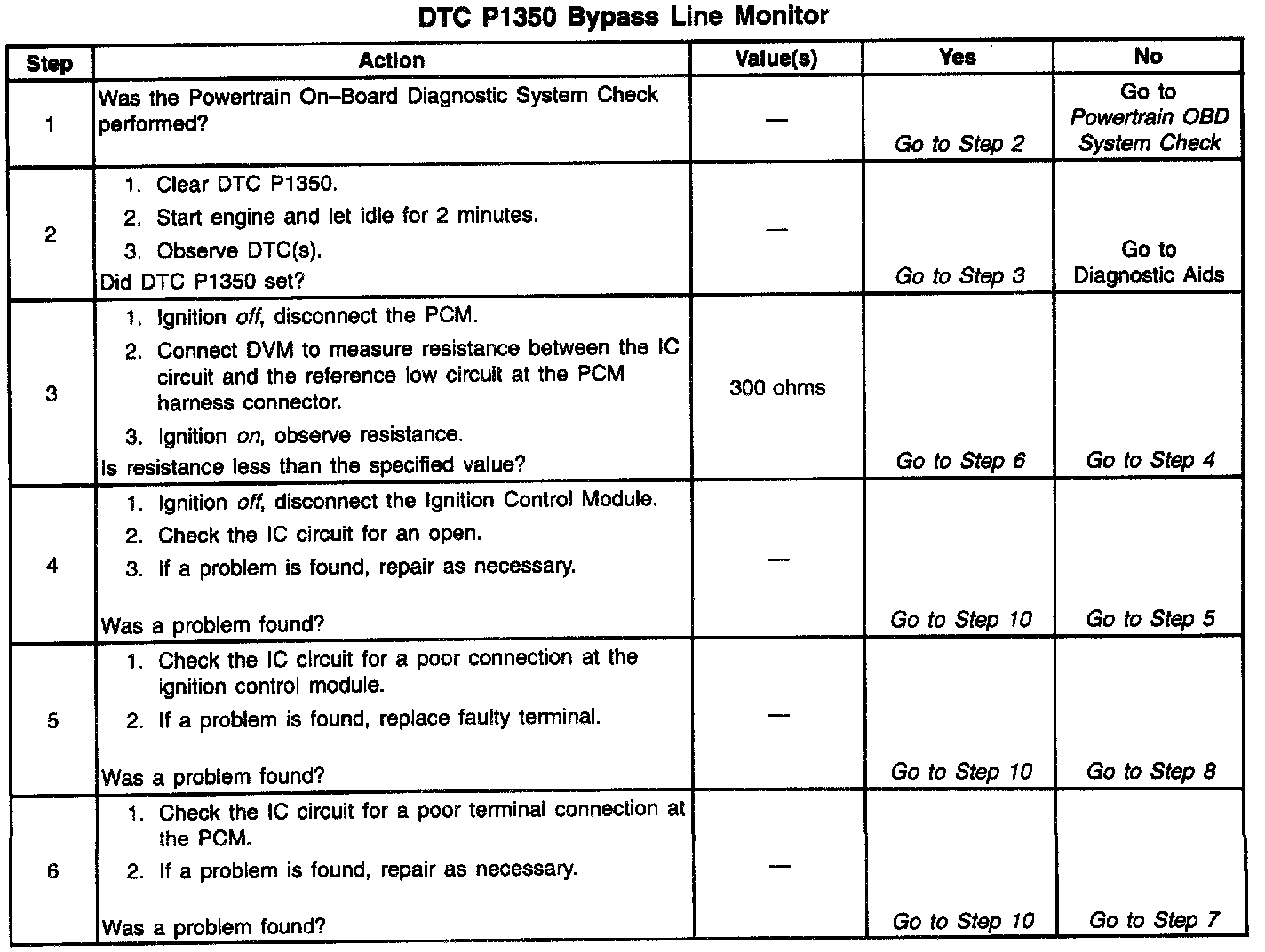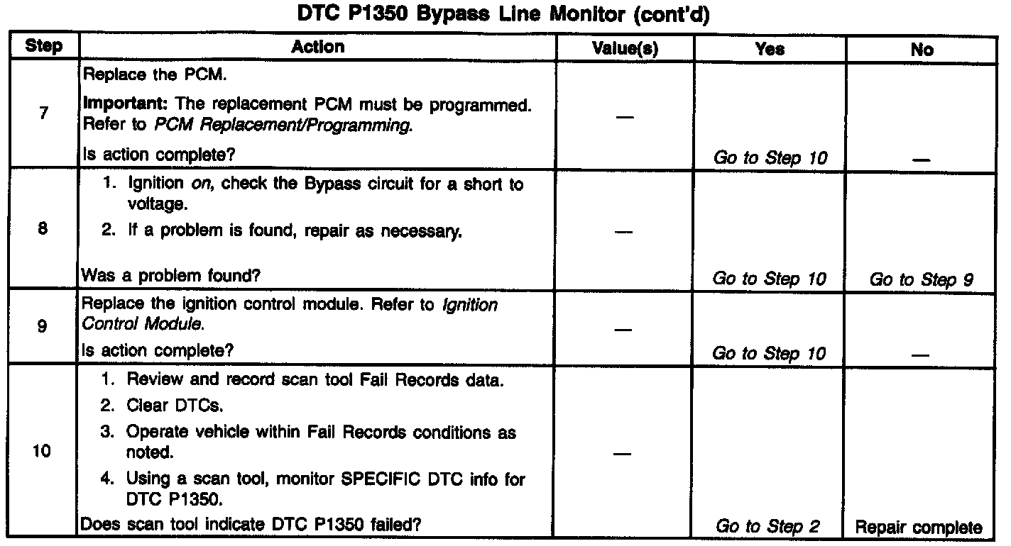 The Ignition Control Module (ICM) sends signals that the PCM requires for fuel control and spark advance calculations. At the start of engine crank, the ICM controls spark advance (Bypass mode.) When the second 3X reference pulse is recognized by the PCM, the PCM applies 5 volts to the Bypass circuit, commanding the ICM to switch spark advance to PCM control (IC mode) An open in the IC circuit or a short to voltage in the Bypass circuit at start-up will cause the PCM to monitor IC pulses during crank, when the ICM should be grounding the IC circuit. This condition will set DTC P1350. The engine may be started but will run on Bypass mode timing.
