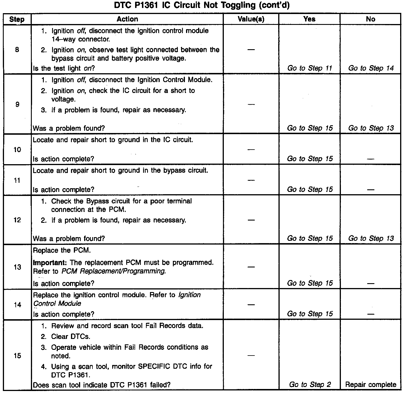 The Ignition Control Module (ICM) sends signals that the PCM requires for fuel control and spark advance calculations At the start of engine crank, the ICM controls spark advance (Bypass mode.) When the second 3X reference pulse is recognized by the PCM, the PCM applies 5 volts to the Bypass circuit. The 5 volts on the Bypass circuit commands the ICM to switch spark advance to PCM control (IC mode). At this time, the ICM will remove the ground it has applied to the IC circuit. When the IC pulses are not grounded, the ICM can use the IC pulses to control spark advance. A short in the IC circuit or an open or short to ground in the Bypass circuit will cause the PCM to monitor no IC pulses after the PCM has switched the Bypass circuit on. The PCM will set DTC P1361 under either of these conditions. The engine may be started but will run on Bypass mode timing.