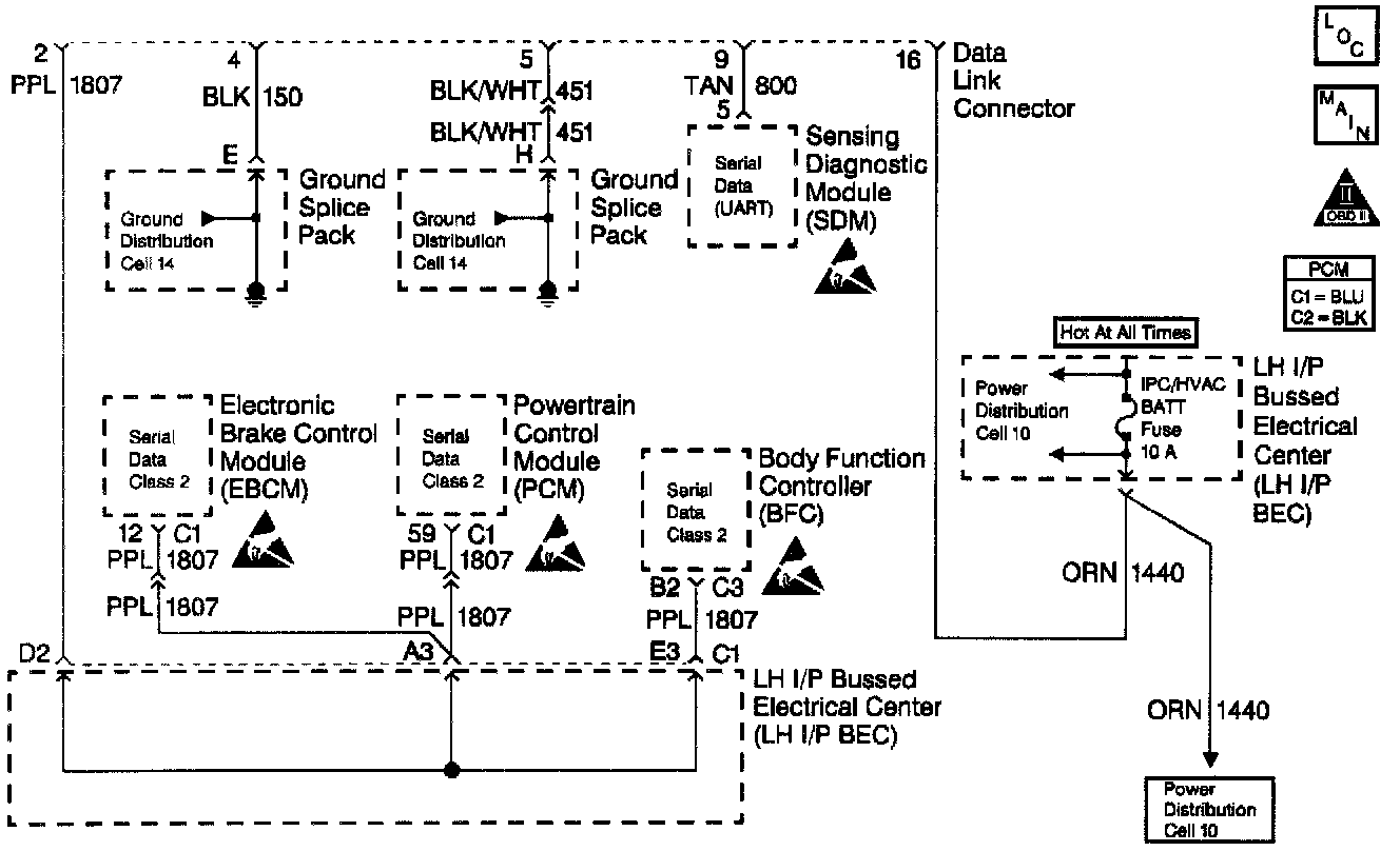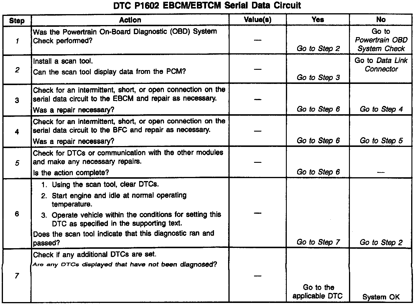 A Class II serial data communications system is used on this vehicle to allow various modules to communicate and share information with each other. Each bit of information has one of two lengths: long or short. This allows vehicle wiring to be reduced and the transmission and reception of multiple signals over a single wire. The messages carried on a Class II serial data streams are also prioritized. If two messages attempt to establish communications on the data line at the same time, the message with the higher priority will continue. The message with the lower priority message will wait. If a module cannot respond to the PCM, a DTC is stored.