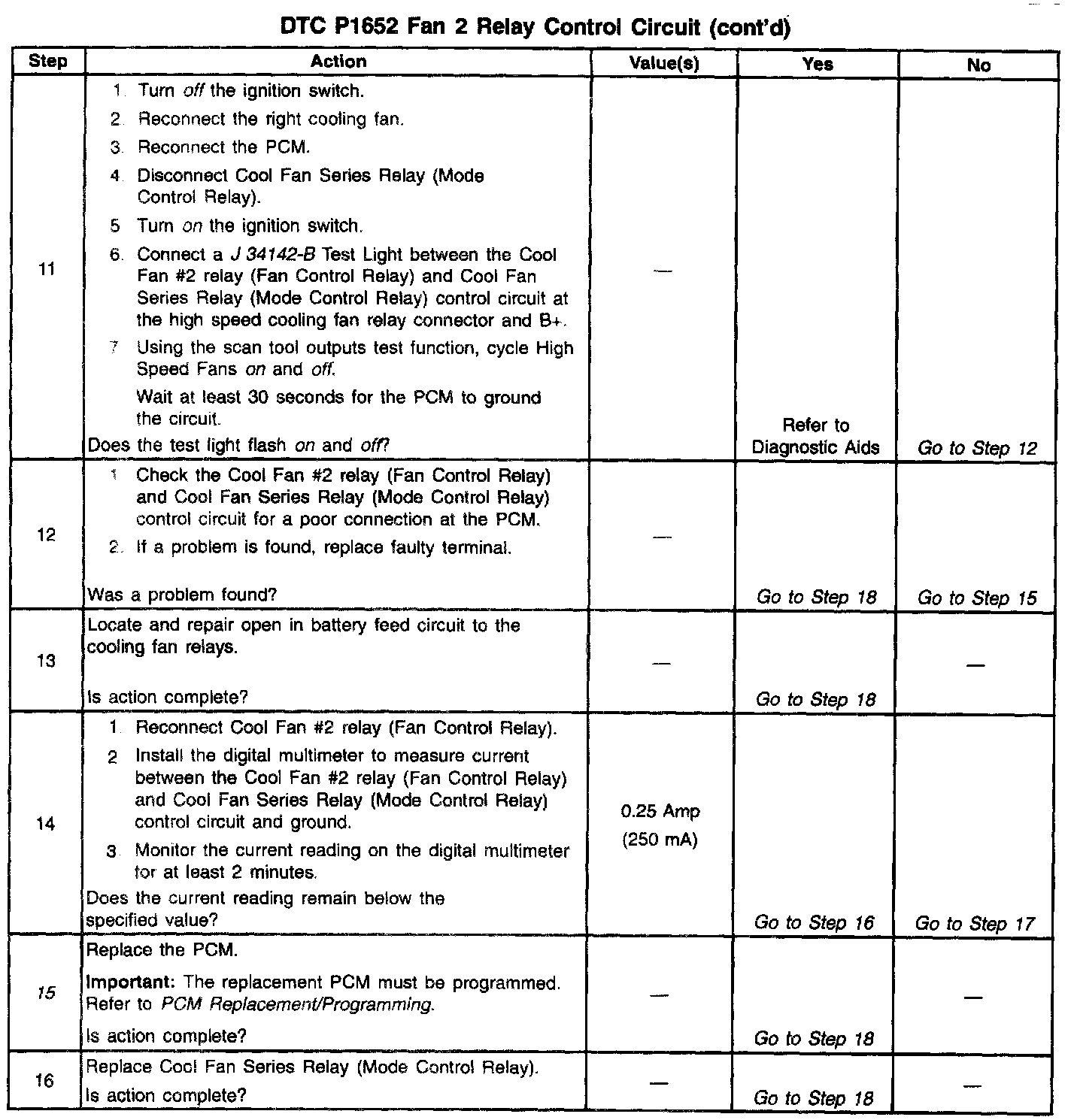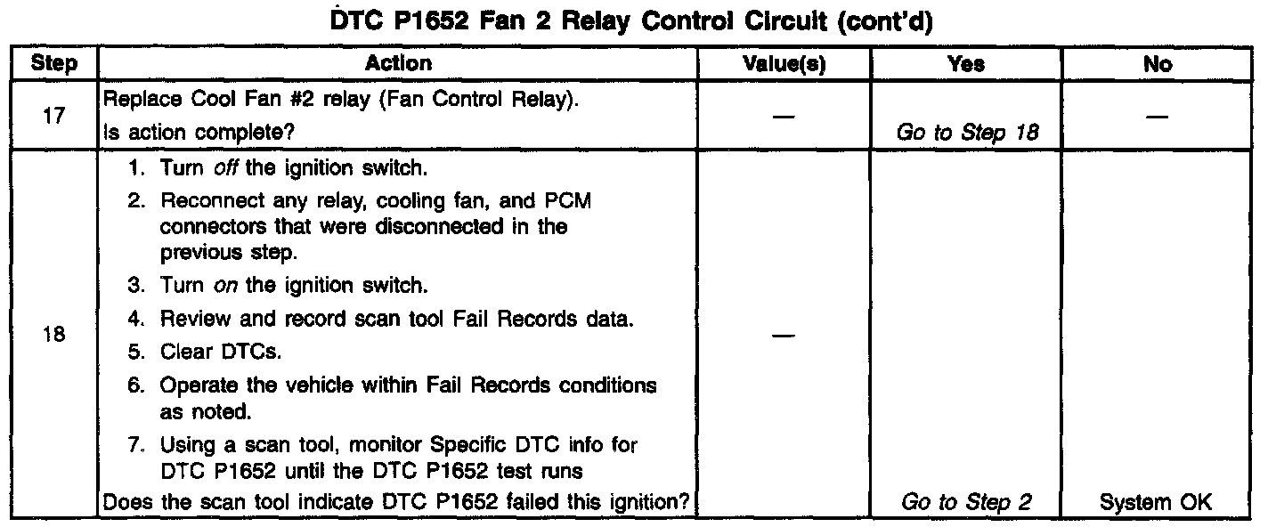 Output Driver Modules (ODMs) are used by the PCM to turn on many of the current-driven devices that are needed to control various engine and Transaxle functions. Each ODM 5 capable of controlling up to 7 separate outputs by applying ground to the device which the PCM is commanding ON. Unlike the Quad Driver Modules (QDMs) used in prior model years, ODMs have the capability of diagnosing each output circuit individually. DTC P1652 set indicates an improper voltage level has been detected on the driver which controls the Cool Fan #2 Relay (Fan Control Relay #2) and Cool Fan Series Relay (Mode Control Relay)