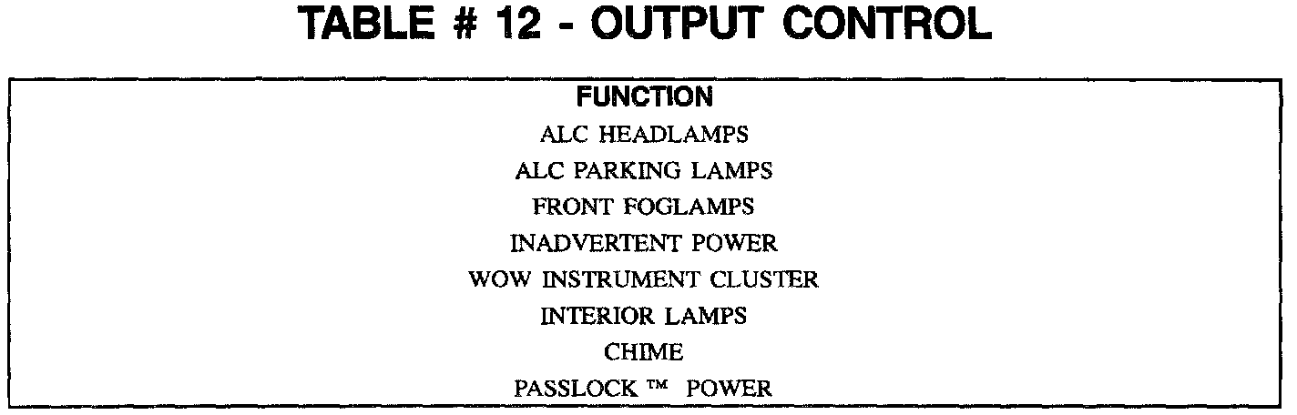In this mode of operation the technician is capable of turning on and off almost all of the Body Function Controller (BFC) outputs. The functions that can be controlled are found under the Output Control menu. The information in TABLE #12 shows what outputs the scan tool can command.