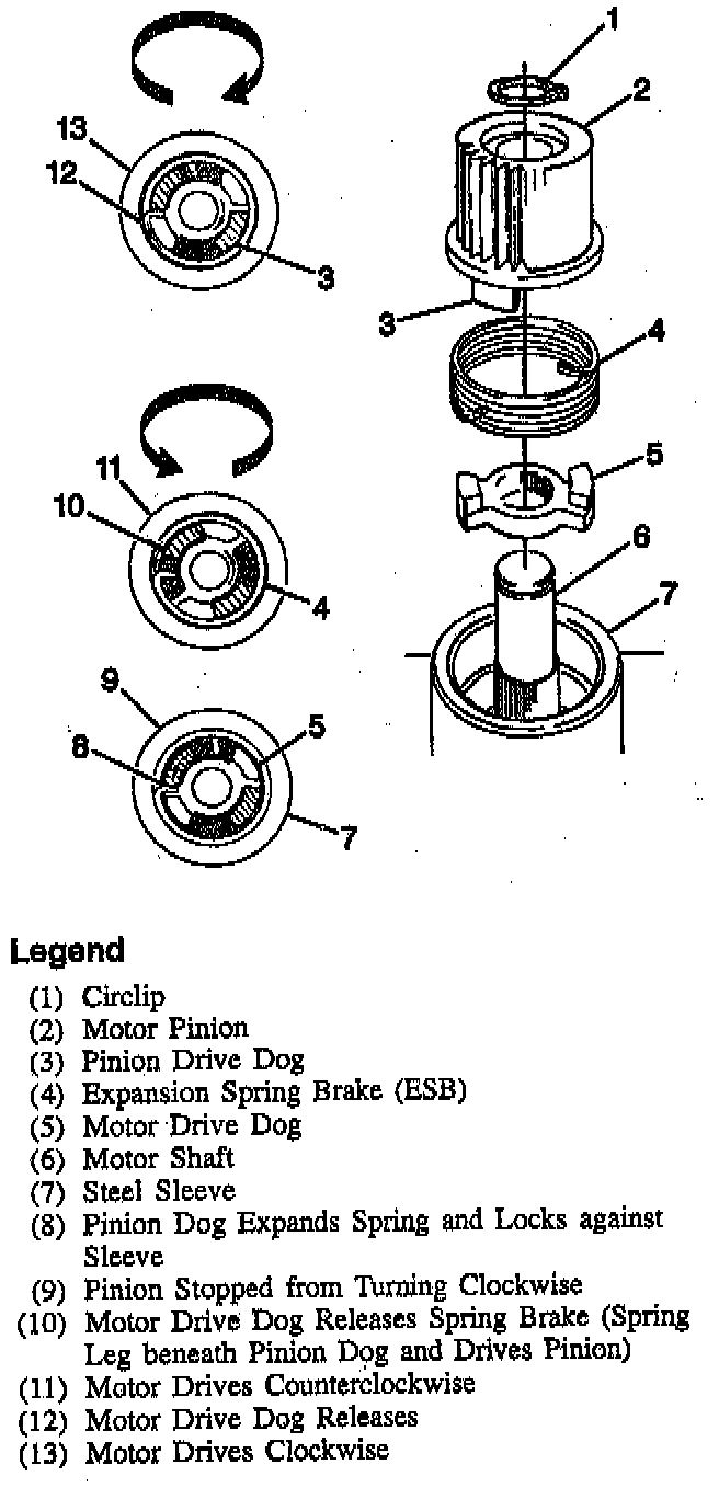 The Expansion Spring Brake (ESB) is used to hold the piston in the uproots (or home) position. An ESB is a spring that is retained in a housing at a close tolerance. One end of the spring is in contact with the motor drive dog and the other end is in contact with the pinion drive dog. In normal braking, brake pressure is present on the top of the piston, applying a downward force. The force applies a counterclockwise torque to the motor pinion which tries to rotate the spring counterclockwise. The counterclockwise torque expands the spring outward within the housing and prevents gear rotation.
