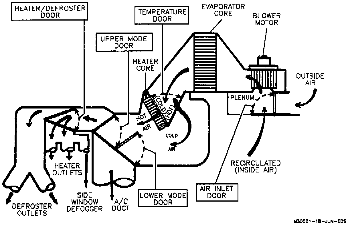 Passenger compartment comfort is maintained by the mix of cooled ambient air and heated air as controlled by the temperature knob on the instrument panel.