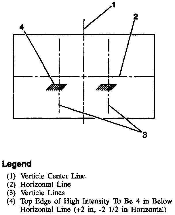 3. The top edge of the high intensity zone shall be 100 mm (4 inch) below the horizontal centerline of the lamps and the center of the high intensity zone shall be on the vertical centerline of the lamps when projected on a screen 7.6 m (25 feet) away.