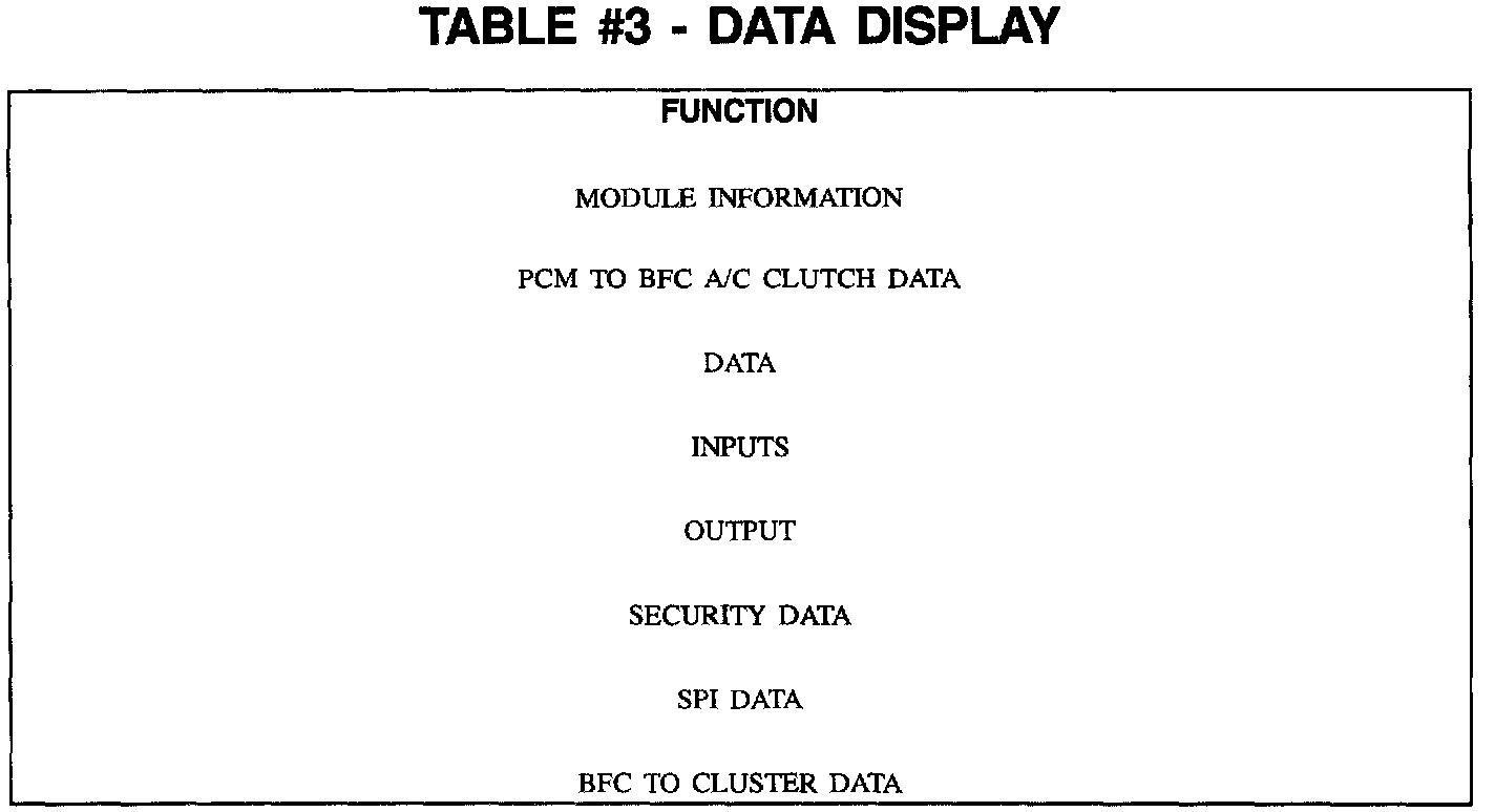 In this mode of operation, the scan tool allows the technician to command the Body Function Controller (BFC) to display its various inputs, outputs, and Instrument Cluster information for ease in diagnosis. This mode can be used to determine whether the Body Function Controller (BFC) is receiving data correctly from the Body Function Controller (BFC) inputs, the Instrument Cluster or the Powertrain Control Module (PCM) and if the computer systems are operating properly. The choice of inputs that can be read are listed in TABLE #3.