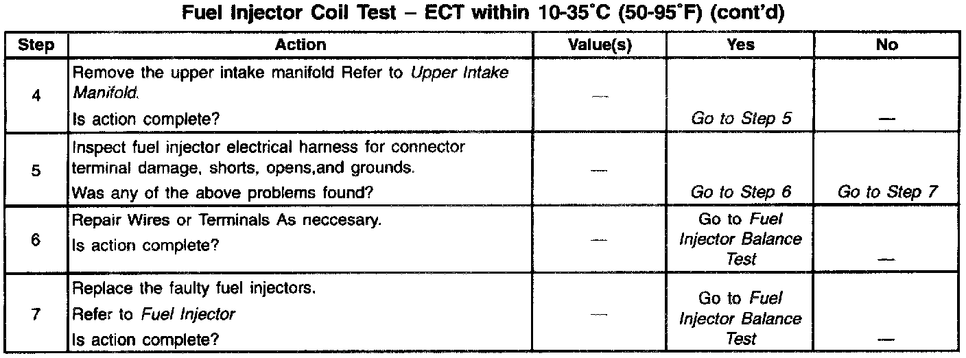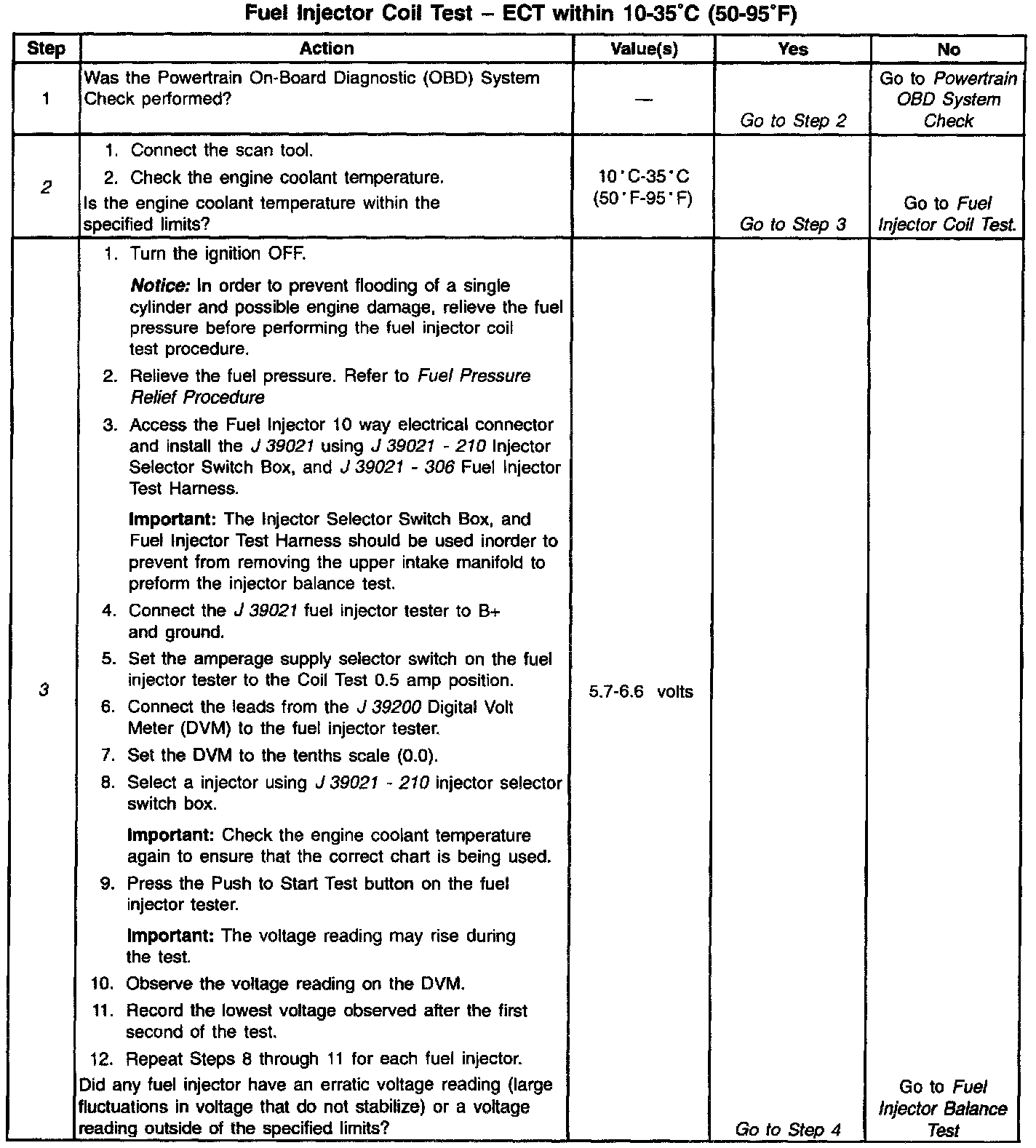 2. The engine coolant temperature affects the ability of the fuel injector tester to detect a faulty fuel injector If the engine coolant temperature is NOT between 10°C and 35°C (50°F and 95°F), go to Fuel Injector Coil Test Procedure Engine Coolant Temperature Less Than 10°C (50°F) or Greater Than 35°C (95°F).