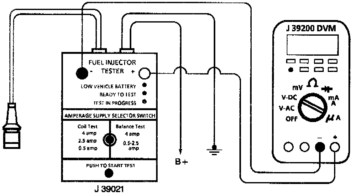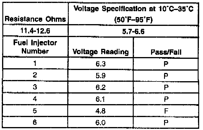 3. The first second of the voltage displayed by the DVM may be inaccurate due to the initial current surge therefore, record the lowest voltage displayed by the DVM after the first second of the test. The voltage displayed by the DVM should be within the specified range (refer to the Example). The voltage displayed by the DVM may increase throughout the test as the fuel injector windings warm and the resistance of the fuel injector windings changes. An erratic voltage reading (large fluctuations in voltage that do not stabilize) indicates an intermittent connection within the fuel injector.