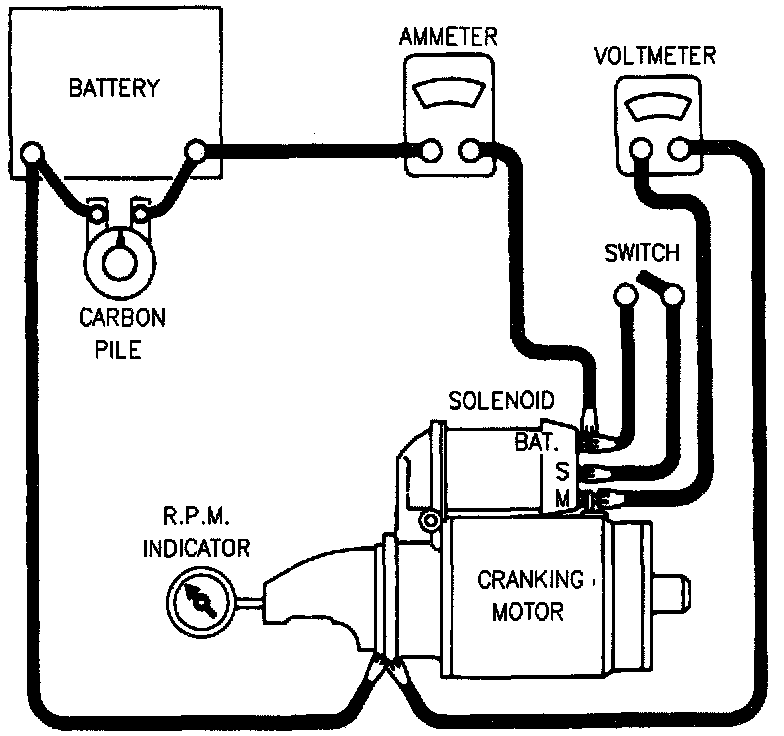 Make connection as shown. Close the switch and compare the RPM, current, and voltage readings with values shown in Starter Usage Chart. If the starter does not meet these values replace the starter. The following conditions indicate possible causes of starter problems: