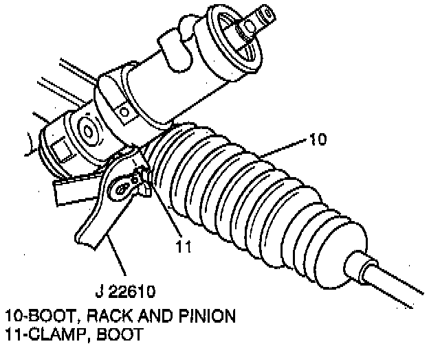 1. New boot clamp (11) onto rack and pinion boot (10).