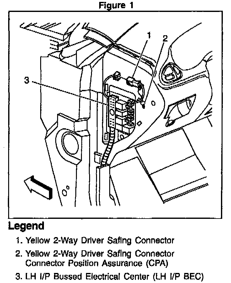 2. The Connector Position Assurance (CPA) and the yellow 2-way driver safing connector located in the LH I/P Bussed Electrical Center (LH I/P BEC).