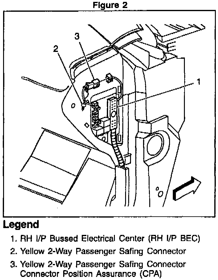 3. The Connector Position Assurance (CPA) and the yellow 2-way passenger safing connector located in the RH I/P Bussed Electrical Center (RH I/P BEC).