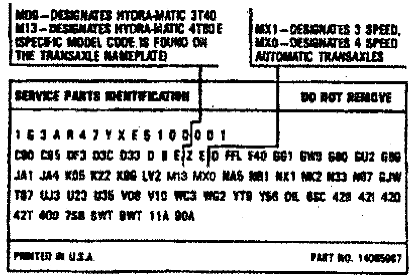 Additional transaxle identification is provided on the Service Parts Identification Label. This label contains information on the Regular Production Options (RPO) as well as standard and mandatory options. This label is affixed to the inside of each vehicle at the assembly plant.