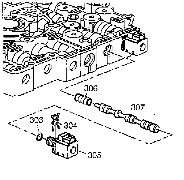 5. Remove the 2-3 shift solenoid retainer clip (304), the 2-3 shift solenoid (305) with O-ring (303), the 2-3 shift valve (307), and the 2-3 shift valve spring (306).