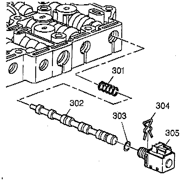 6. Remove the 1-2 shift solenoid retainer clip (304), the 1-2 shift solenoid (305) with O-ring (303), the 1-2 shift valve (302), and the 1-2 shift valve spring (301).