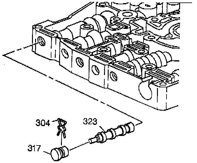 12. Remove the 1-2/3-4 accumulator valve retainer clip (304), the plug (317), and the accumulator valve (323).