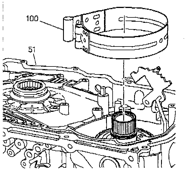 1. Assemble a new Intermediate/Fourth band (100) into the transmission case (51).