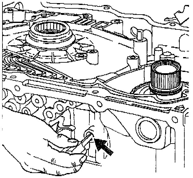 2. In order to verify the proper positioning of the band, insert a screwdriver through the Intermediate/Fourth servo bore. The screwdriver should press on the servo pin rest and compress the band around the reverse clutch housing.