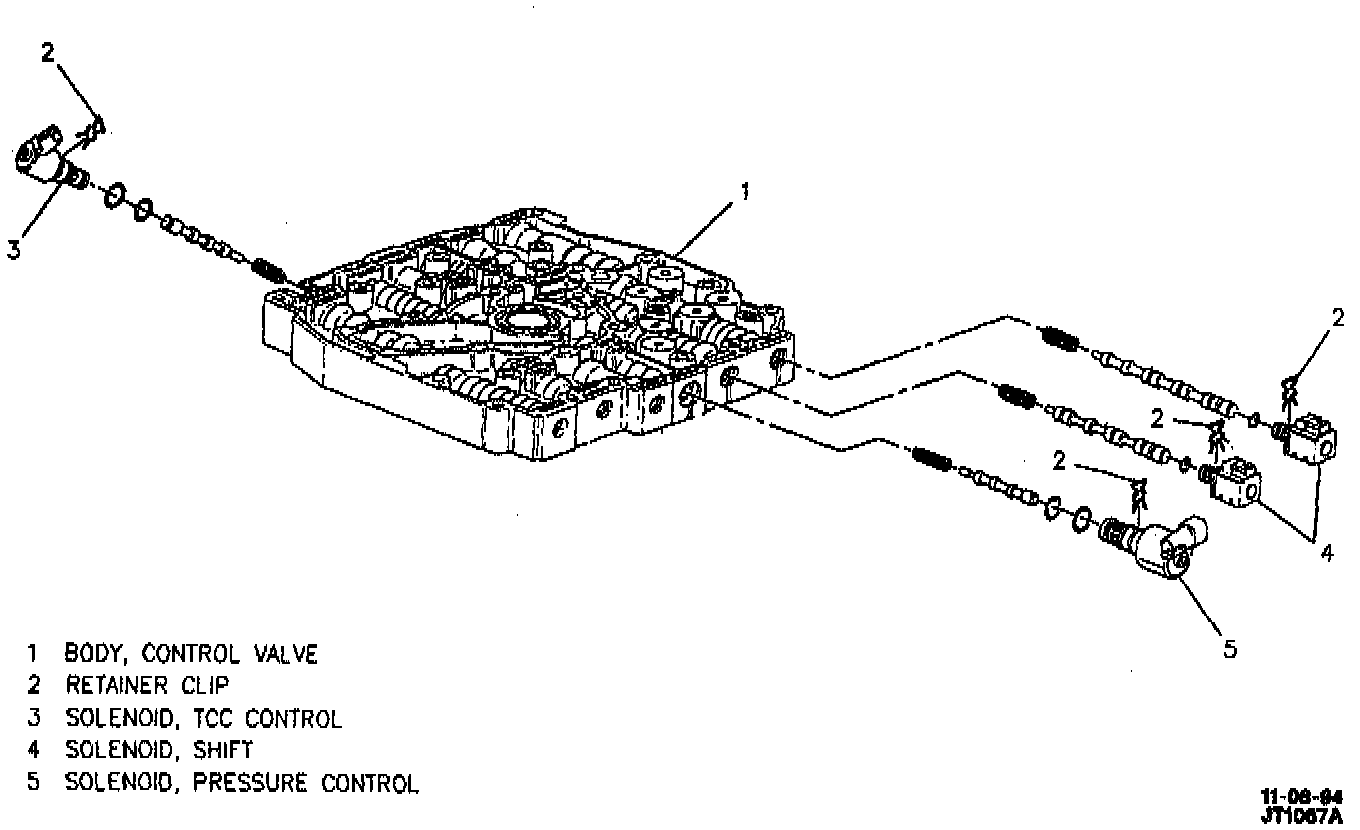 4. A shift solenoid has one O-ring. The pressure control solenoid and TCC solenoid have 2 O-rings. Remove the solenoid and O-ring or O-rings from transaxle.