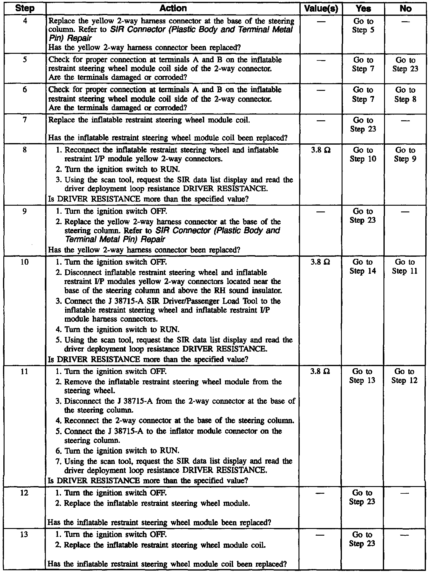 10. This test isolates the malfunction to one side of the inflatable restraint steering wheel module yellow 2-way connector located near the base of the steering column.