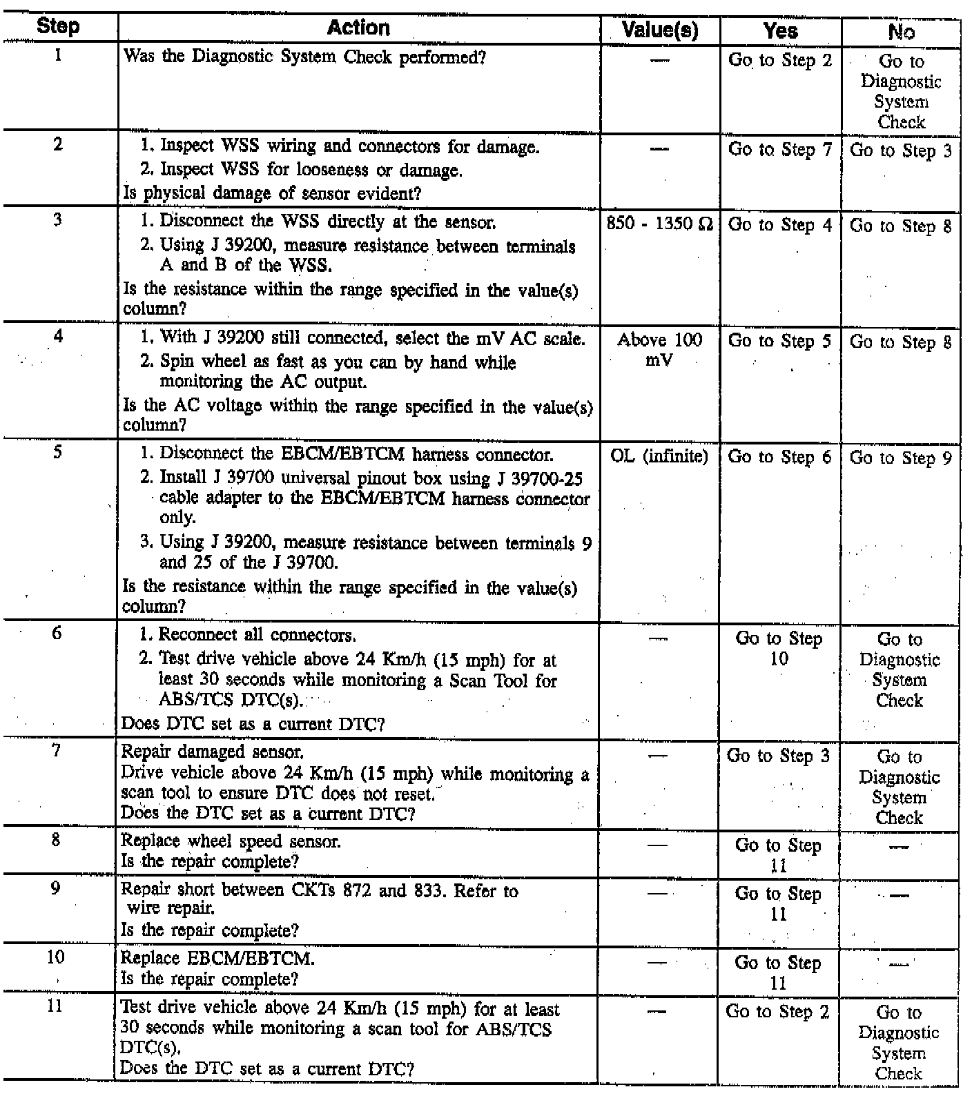 - The DTC will set if the RF wheel speed - 0 and the other WSS are greater than 8 Km/h (5 mph) for 2.5 seconds.