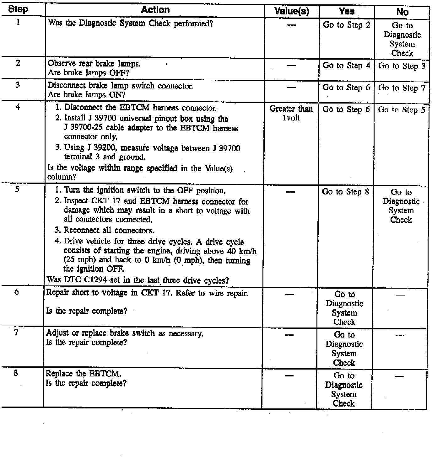 - DTC C1294 can be set if the vehicle speed reaches at least 40 km/in (25 mph). If the brake was never "OFF" during two consecutive drive cycles, a malfunction exists.