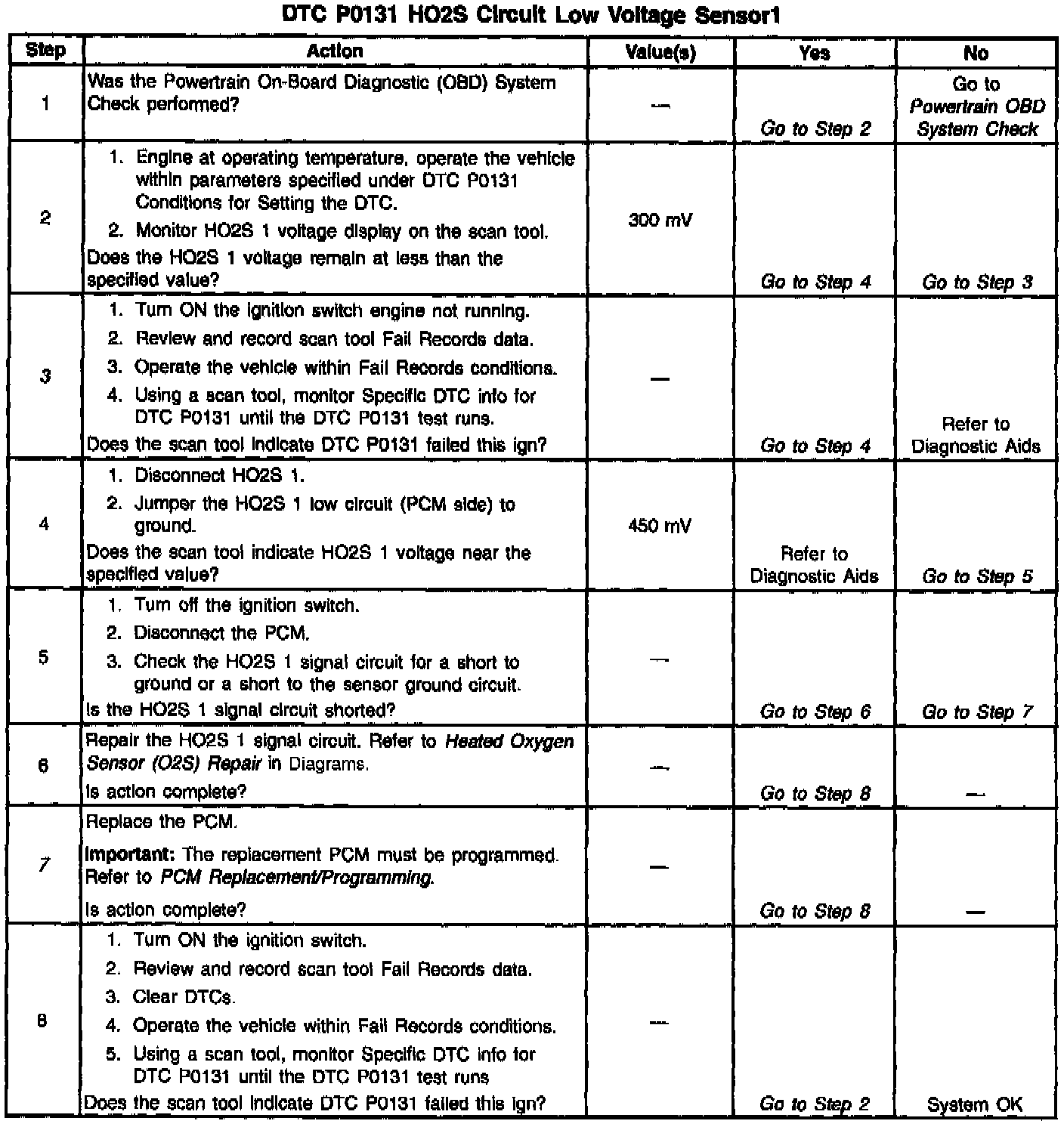 3. DTC P0131 failing during power enrichment operation (TP angle above 60%) may indicate a condition described in Diagnostic Aids. If the DTC P0131 test passes while the Fail Records conditions are being duplicated, an intermittent condition is indicated. Reviewing the Fail Records vehicle mileage since the diagnostic test last failed may help determine how often the condition that caused the DTC to be set occurs. This may assist in diagnosing the condition.