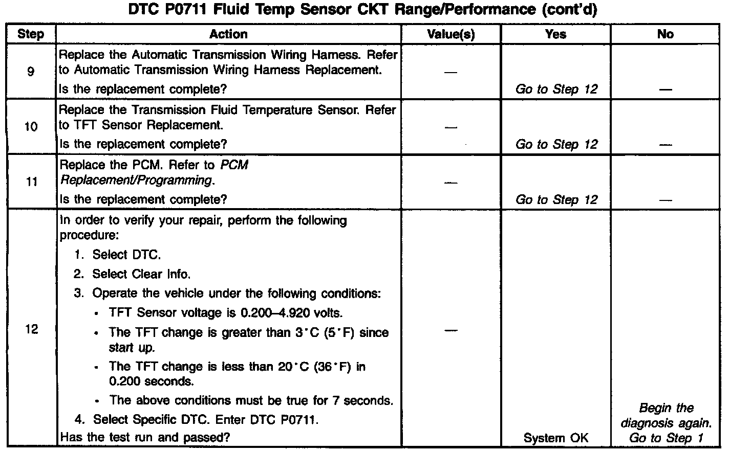 If the PCM detects an intermittent voltage or no voltage change in the TFT sensor circuit, then DTC P0711 sets. DTC P0711 is a Type B DTC.