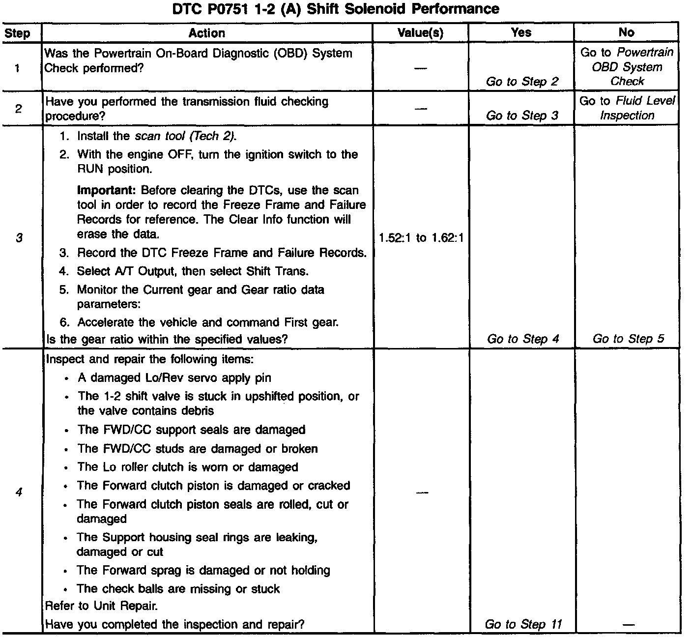 4. This Step verifies that the gear ratio indicated a Second gear start, and the vehicle does not achieve First gear. The list of components should be inspected and repaired if faulty.
