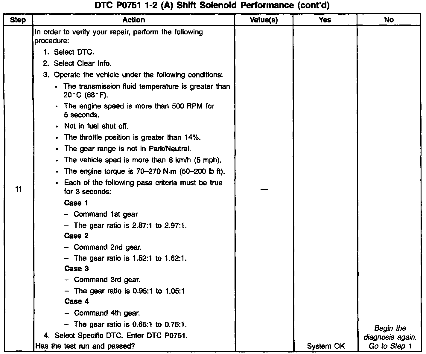 10. This Step verifies that the gear ratio indicates Fourth gear and the vehicle does not achieve Third gear. The list of components should be inspected and repaired if faulty.