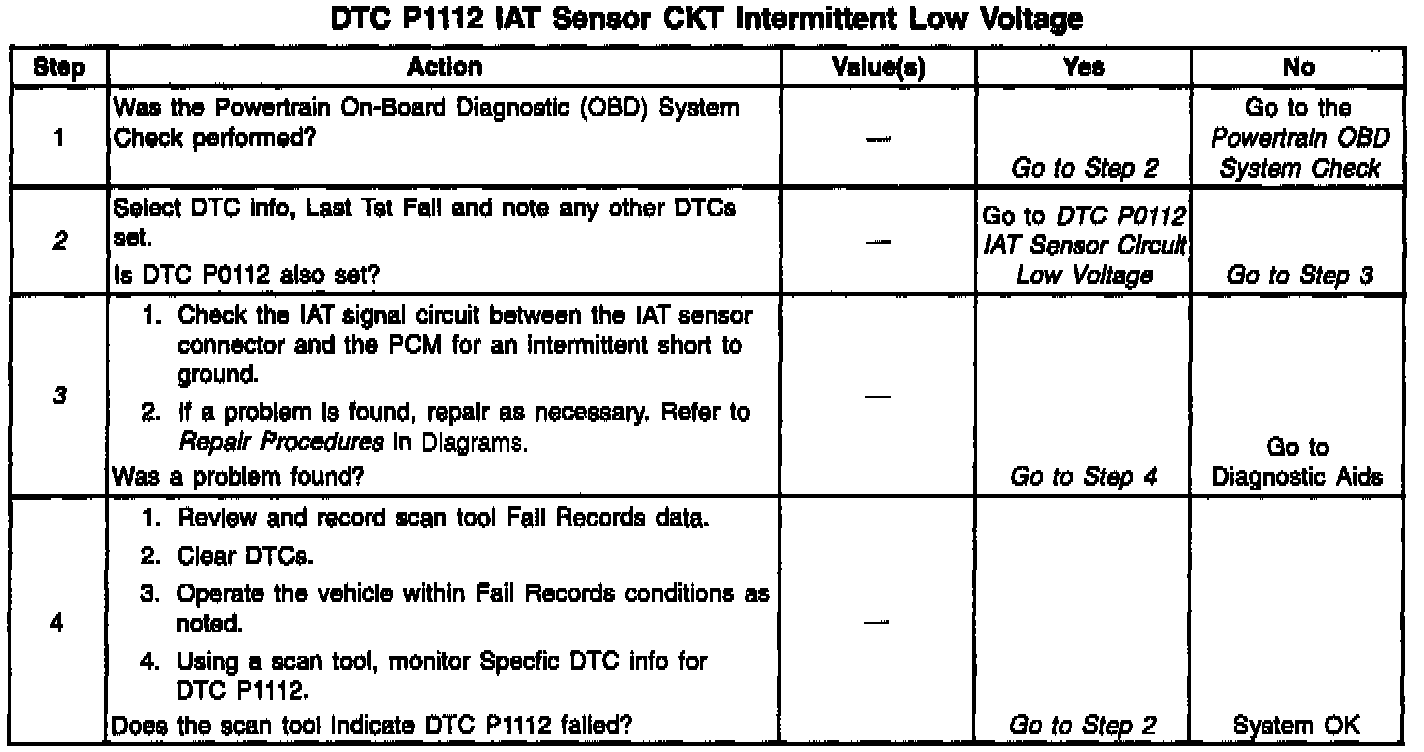 3. If DTC P1112 can be repeated only by duplicating the Fail Records conditions, refer to the Temperature Vs. Resistance Values Table. The table may be used to test the IAT sensor at various temperatures to evaluate the possibility of a shifted sensor that may be shorted above or below a certain temperature. It this is the case, replace the IAT sensor. Specifications