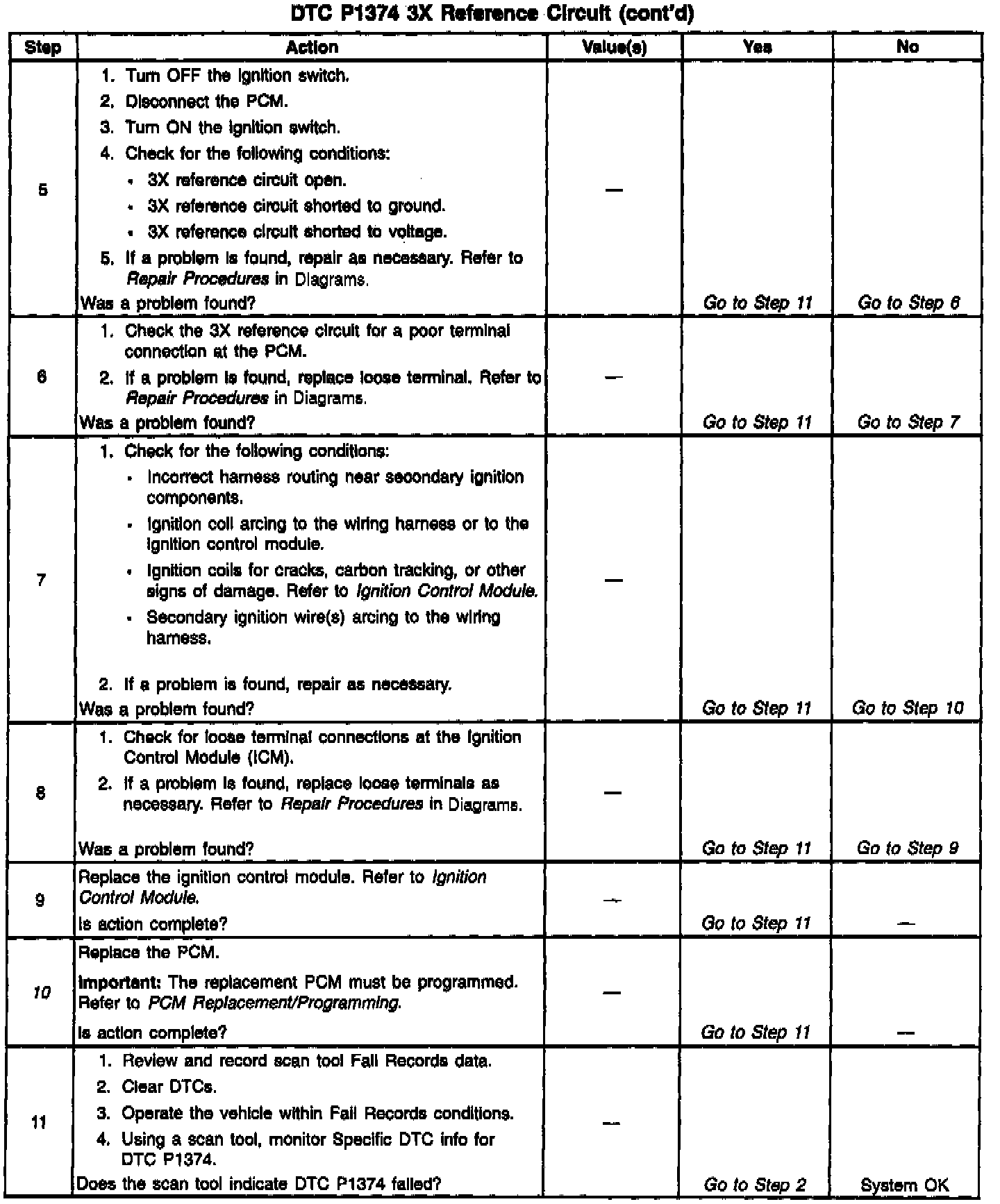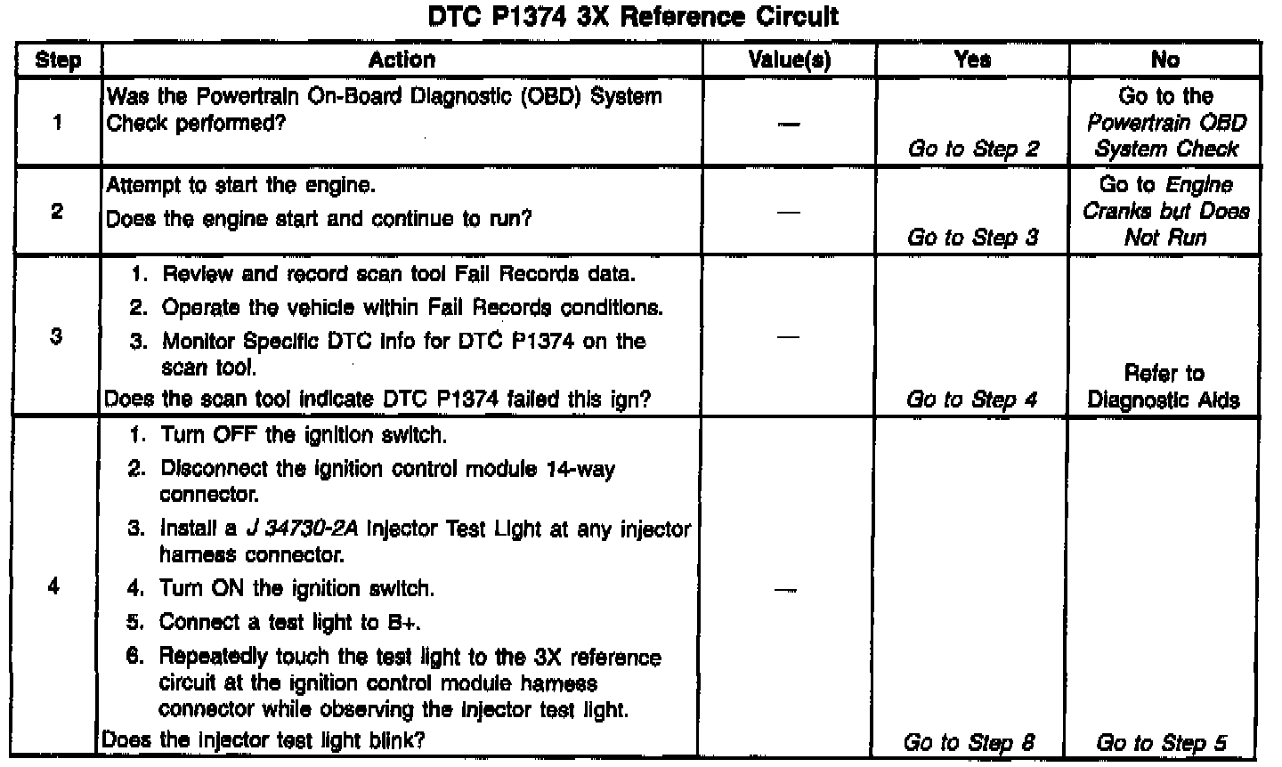 The 3X reference signal is produced by the ignition control module. The ICM calculates the 3X reference signal by dividing the Crankshaft Position (CKP) sensor 18X pulses by 3 when the engine is running and CKP sync pulses are also being received. The PCM uses the 3X reference signal to calculate engine rpm and crankshaft position at engine speeds above 1200 rpm. The PCM also uses the pulses on this circuit to initiate injector pulses. The PCM constantly monitors the number of pulses on the 3X reference circuit and compares the number of 3X reference pulses to the number of 18X reference pulses and CAM signal pulses being received. If the PCM receives an incorrect number of pulses on the 3X reference circuit, DTC P1374 will set and the PCM will use the 18X reference signal circuit for fuel and ignition control. The engine will continue to start and run using the 18X reference and Camshaft Position PCM input signals only.