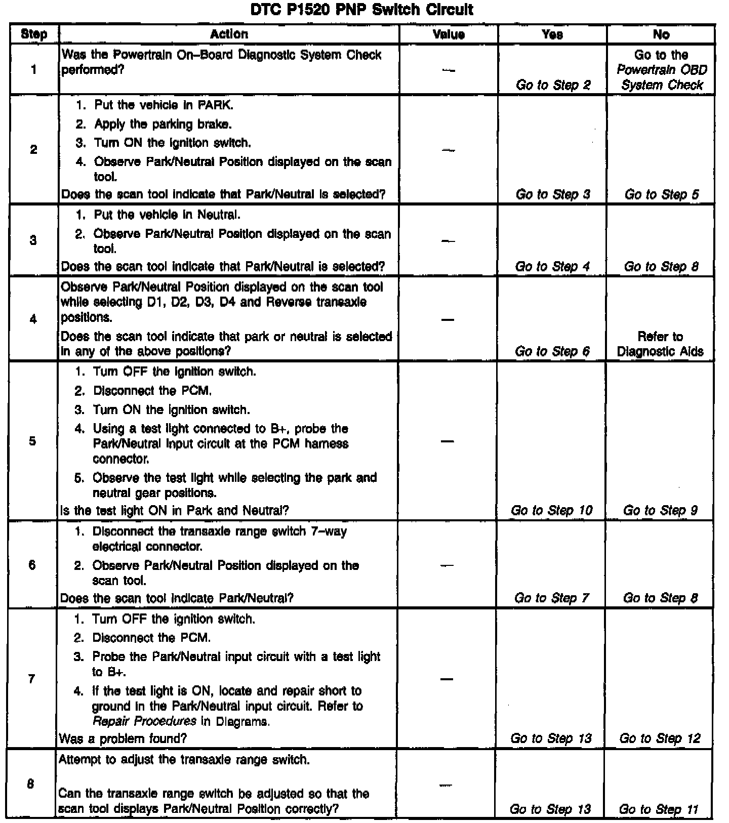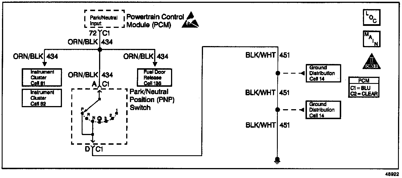 The PCM supplies 12 volts to the PNP input circuit through a current limiting resistor. The PCM senses a closed switch (Park or Neutral selected) when the voltage on the PNP input circuit drops below 1 volt.