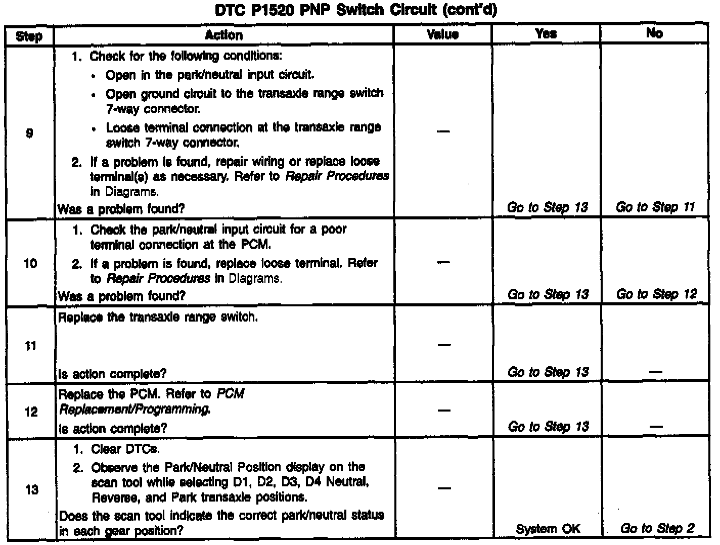 The signal on the PNP circuit indicates park or neutral not selected (an open PNP switch) during 3 consecutive start-ups.
