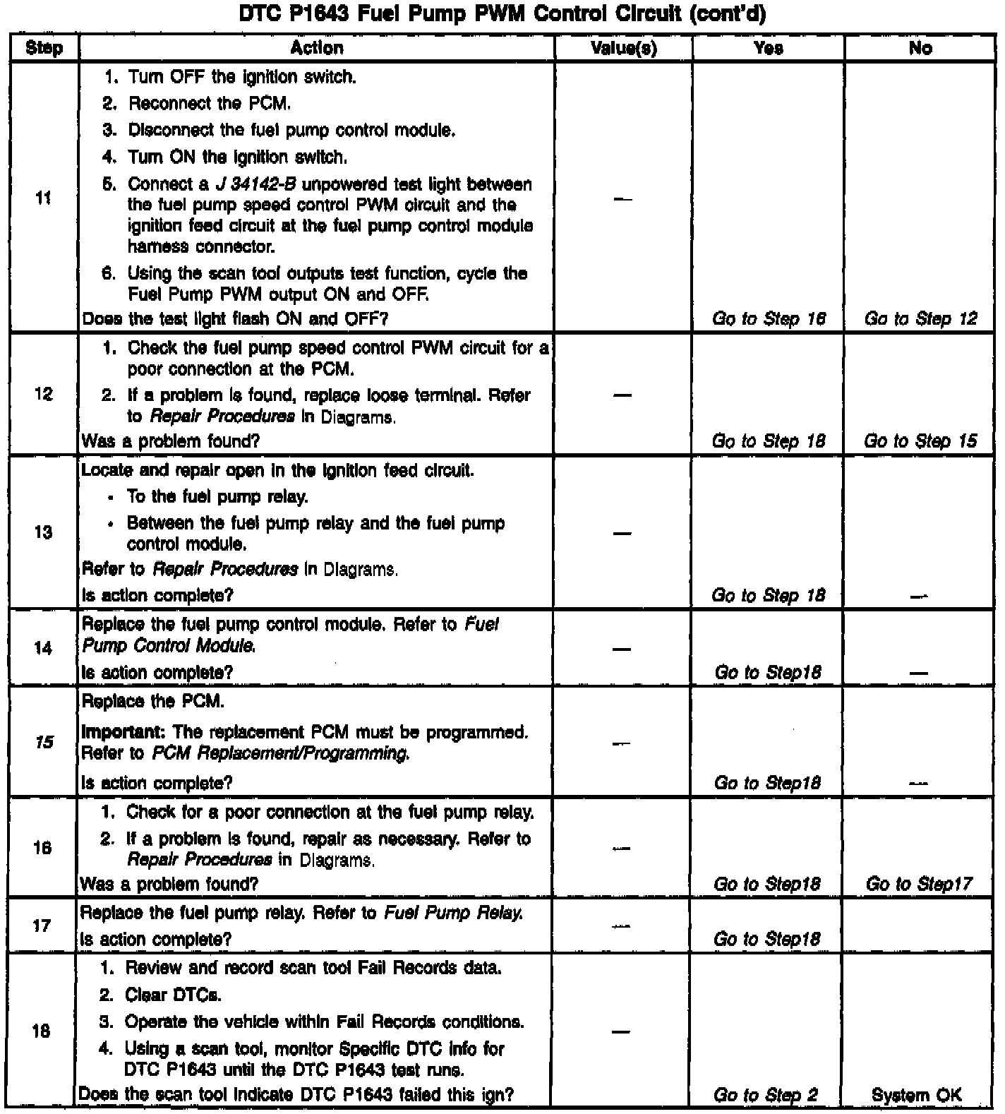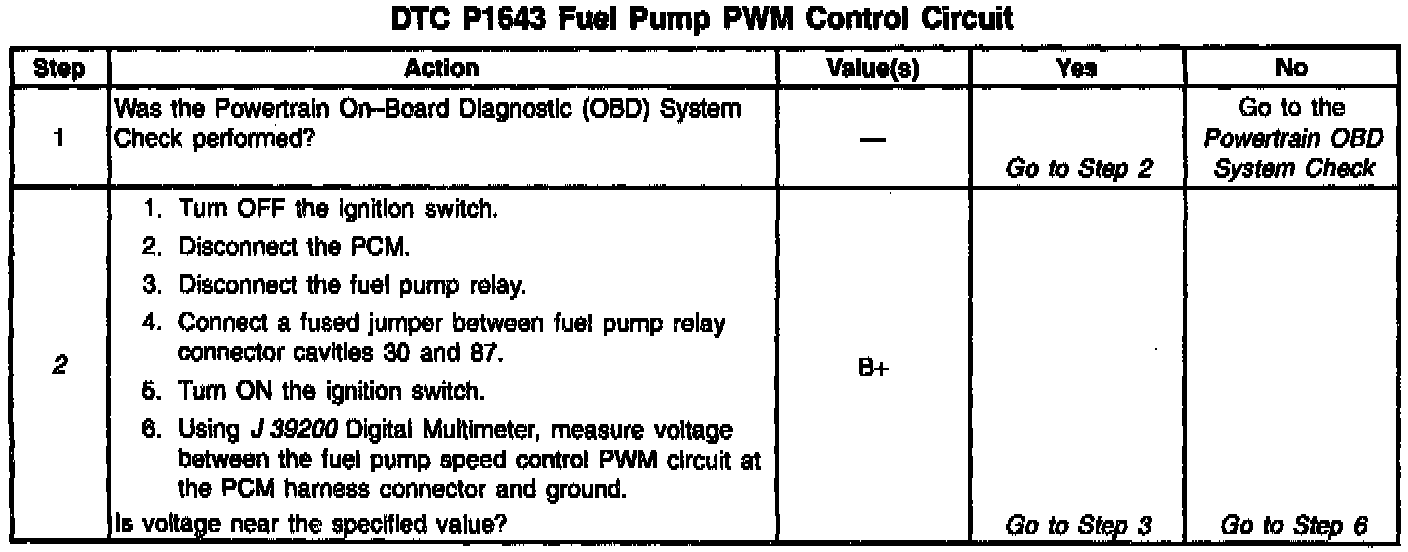 Output Driver Modules (ODMs) are used by the PCM to turn on many of the current-driven devices that are needed to control various engine and Transaxle functions. Each ODM is capable of controlling up to 7 separate outputs by applying ground to the device which the PCM is commanding ON. Unlike the Quad Driver Modules (QDMs) used in prior model years, ODMs have the capability of diagnosing each output circuit individually. DTC P1643 set indicates an improper voltage level has been detected on ODM A output 3, which controls the Fuel Pump Pulse Width Modulation (PWM) signal to the fuel pump control module.