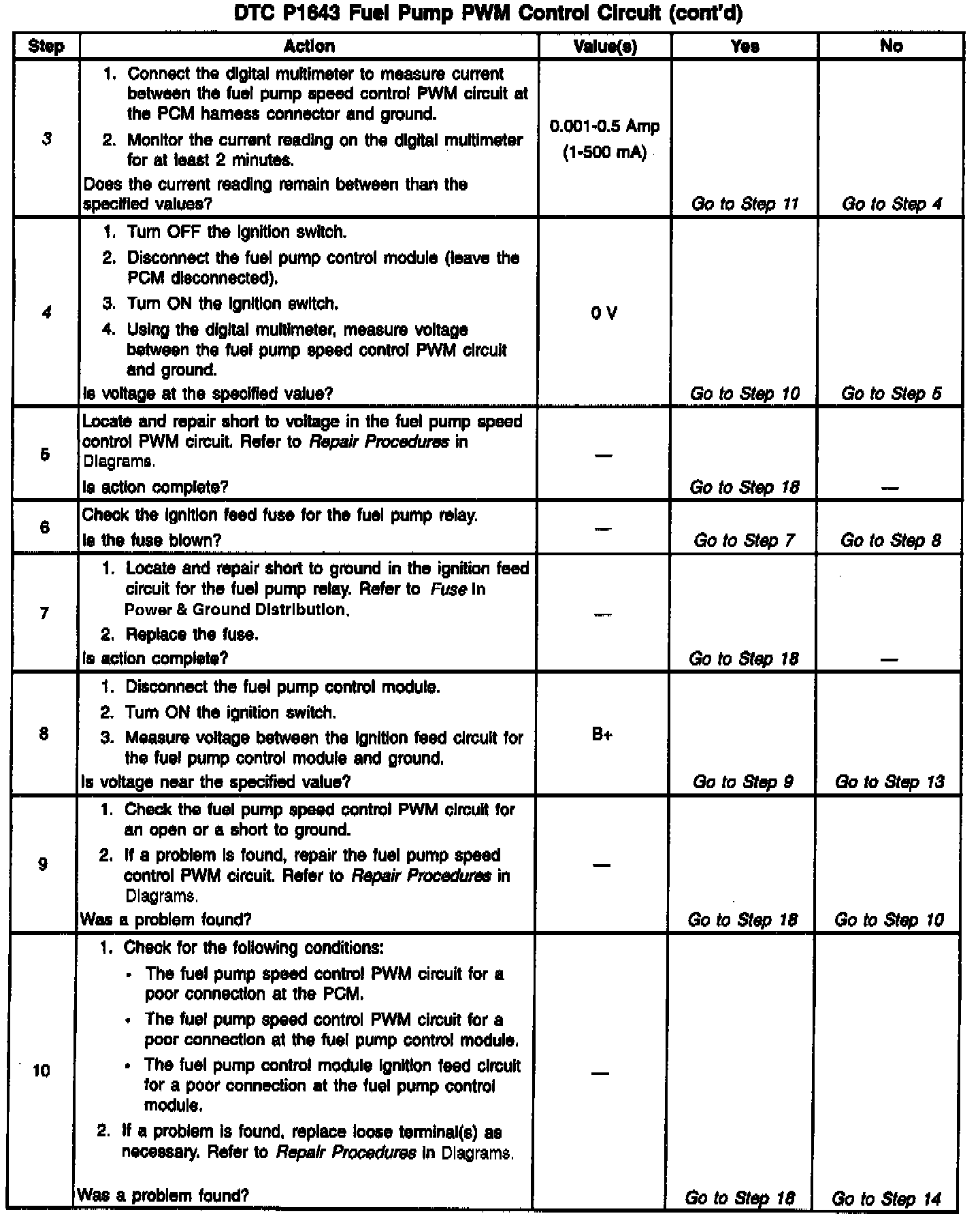3. Checks for a shorted component or a short to B+ on the control circuit. Either condition would result in a measured current of over 500 milliamps. Also checks for a component that is going open while being operated, resulting in a measured current of 0 milliamps.