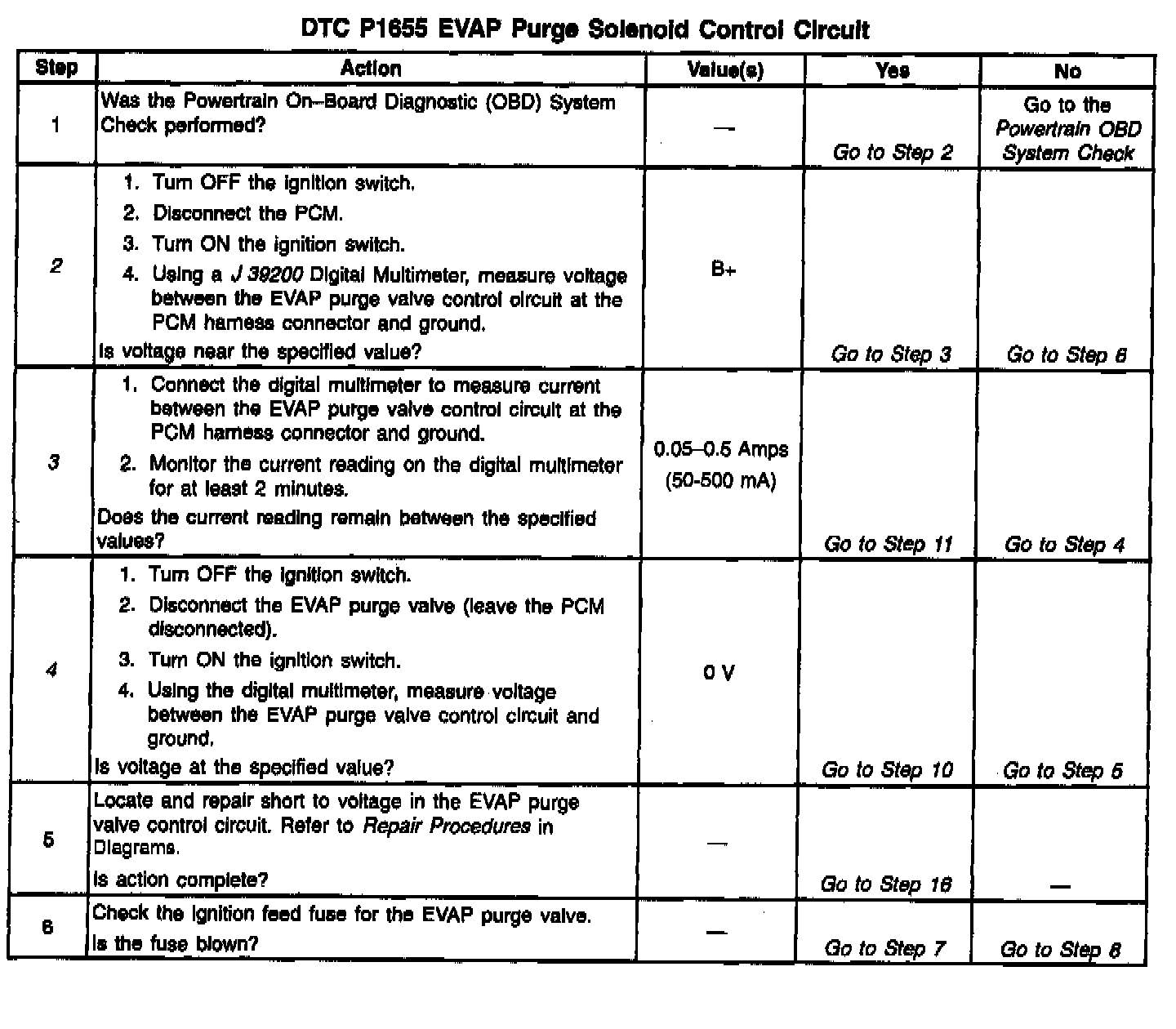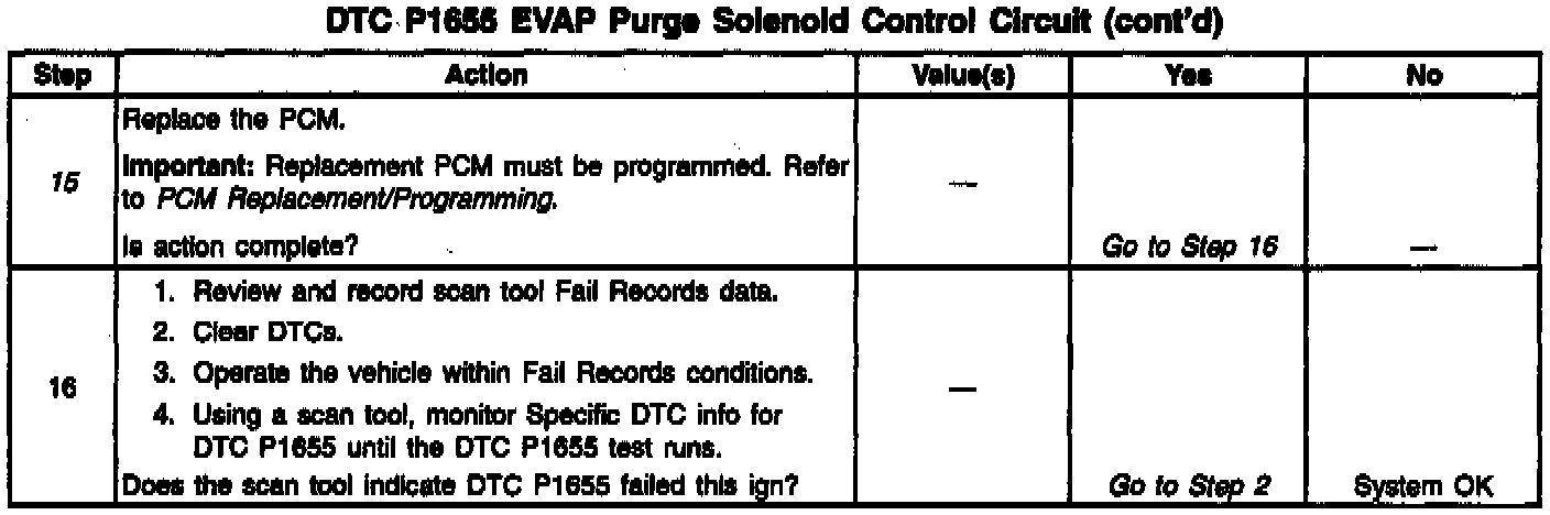 Output Driver Modules (ODMs) are used by the PCM to turn on many of the current-driven devices that are needed to control various engine and Transaxle functions. Each ODM is capable of controlling up to 7 separate outputs by applying ground to the device which the PCM is commanding ON. Unlike the Quad Driver Modules (QDMs) used in prior model years, ODMs have the capability of diagnosing each output circuit individually. DTC P1655 set indicates an improper voltage level has been detected on ODM B output 5, which controls the EVAP purge solenoid.