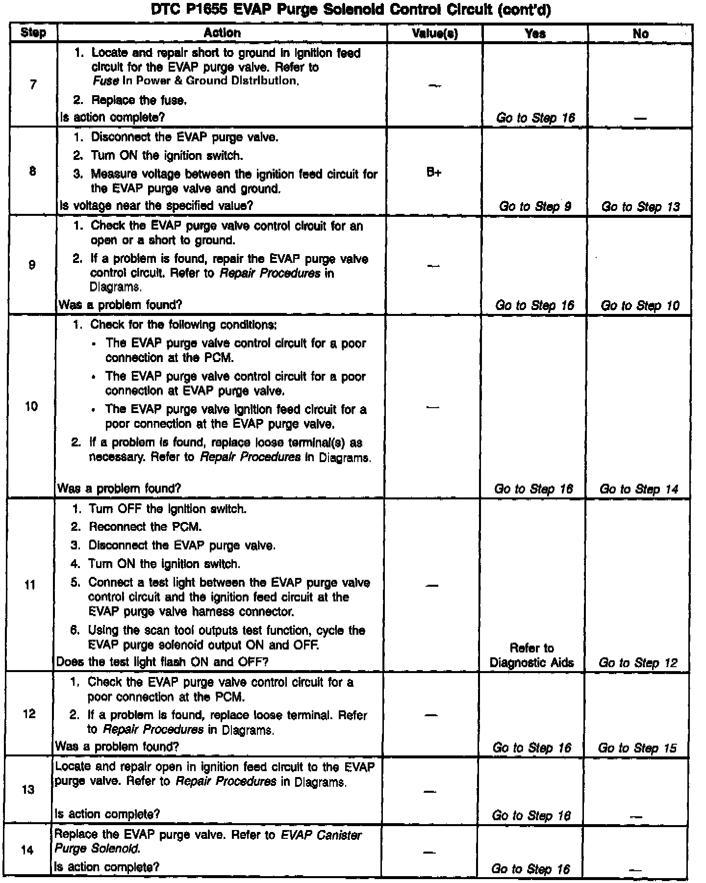 ^ If the harness appears to be OK, disconnect the PCM, turn the ignition ON and observe a voltmeter connected between the EVAP purge valve control circuit and ground at the PCM harness connector while moving connectors and wiring harnesses related to the EVAP purge valve. A change in voltage will indicate the location of the malfunction.