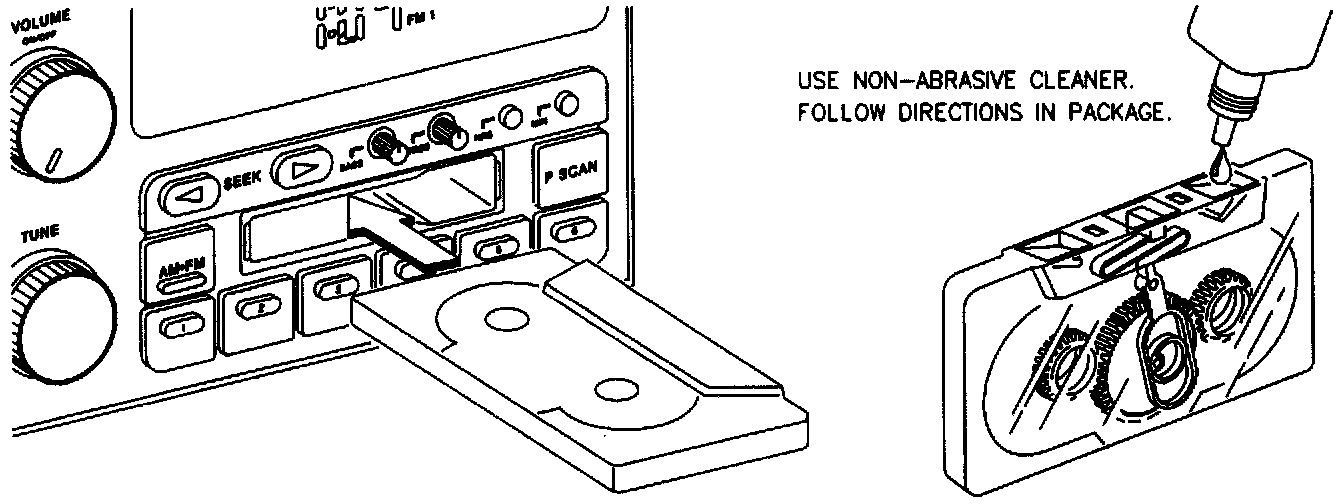 There are two parts that are cleaned on a tape player: the head and the capstan. Since they can be reached through the tape door, leave the tape player in the vehicle. This service should be performed every 15 hours of operation for best performance and every 50 hours of service to prevent damage to the tape head. To clean the head and capstan, use a cotton swab dipped in ordinary rubbing alcohol, or use a cleaning cassette. Do not contact the tape head with magnetized tools. If the head becomes magnetized, every cassette played in the player is degraded. No service is performed on the tapes and warranty of these tapes is handled by the cassette manufacturer, not by the dealer. Any test tape used by the dealer should be stored in its container to keep the tape clean. Store cassettes away from extreme heat or direct sunlight. When leaving the vehicle, cassettes may be left in auto-reverse tape players.