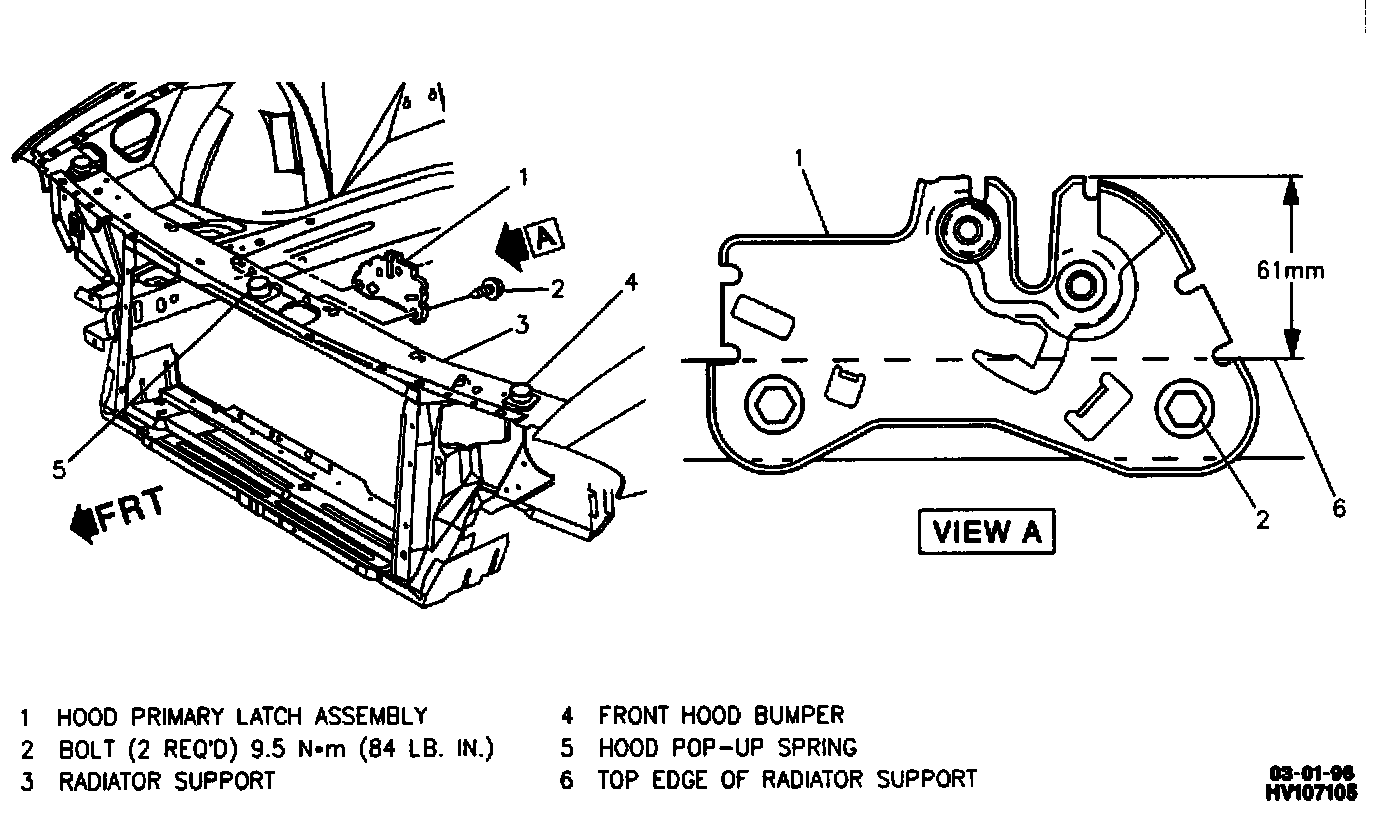 The hood latch is attached to radiator support. The bolt holes are elongated to help in adjustment. The hood latch should be lubricated as recommended.