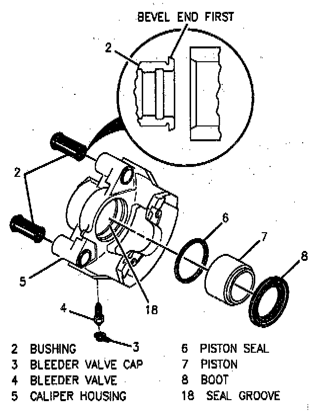 7. Bleeder valve from caliper. Clean All parts in clean, denatured alcohol. Dry with unlubricated compressed air. Blow out all passages in caliper housing and bleeder valve.