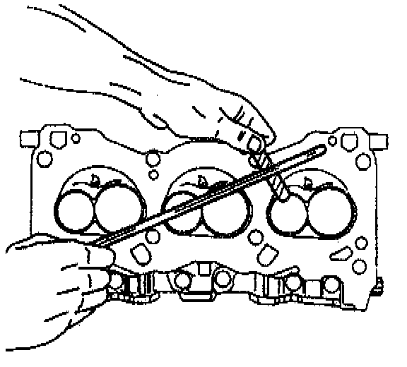 6. Inspect the cylinder head for cracks. Inspect between the valve seats. Inspect inside of the exhaust ports.
