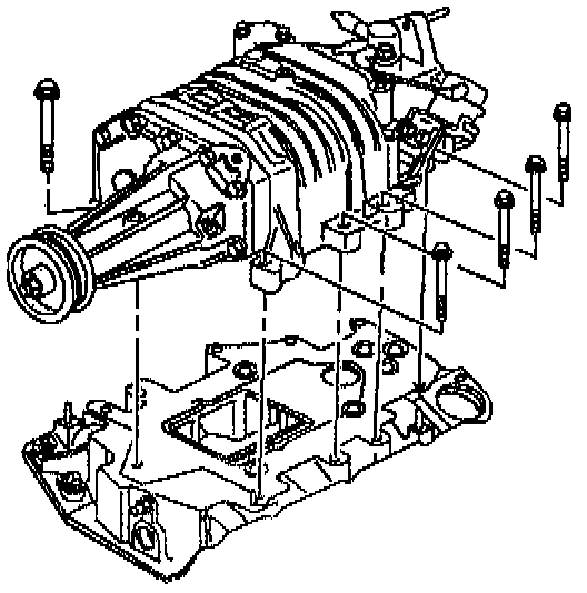 c. Install the spacers, bolts, and stud to the supercharger in the proper locations. Tighten the stud/bolts to 23 Nm (17 ft. lbs.).