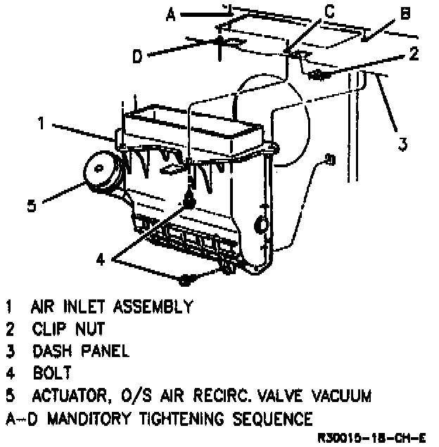 1. Bolts attaching air inlet to dash panel and front of dash after positioning air inlet in vehicle (peel back insulation as necessary).