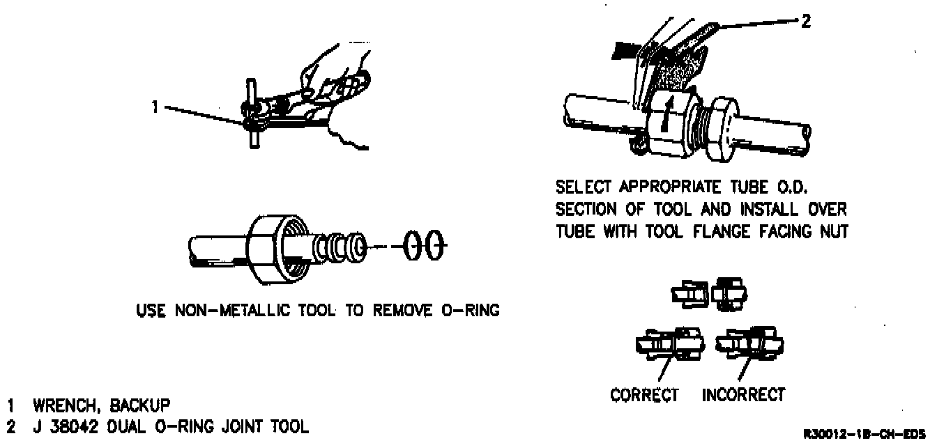 2. Place tool J 38042 on the refrigerant line directly behind dual O-ring joint female nut and hold pressure against nut.