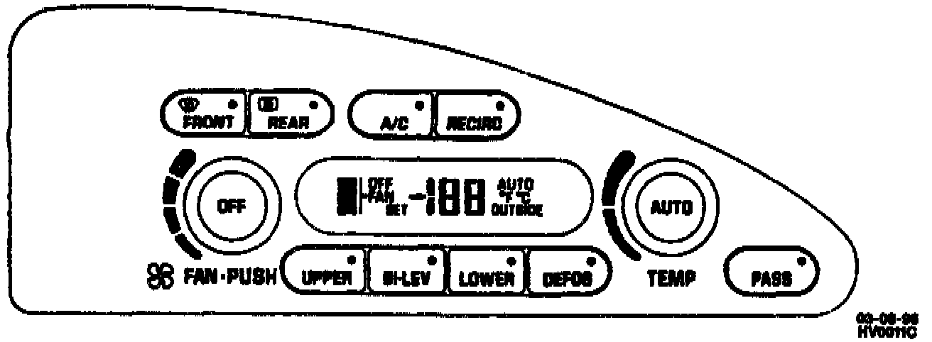 The heater and A/C control allows the vehicle operator to communicate with the electronic A/C system. The heater and A/C control includes soft touch buttons for the various system operating modes, a temperature increase/decrease knob, a fan speed increase/decrease knob and a vacuum fluorescent (VF) information display panel. When the parklamps or headlamps are turned on, the buttons and knobs are illuminated.