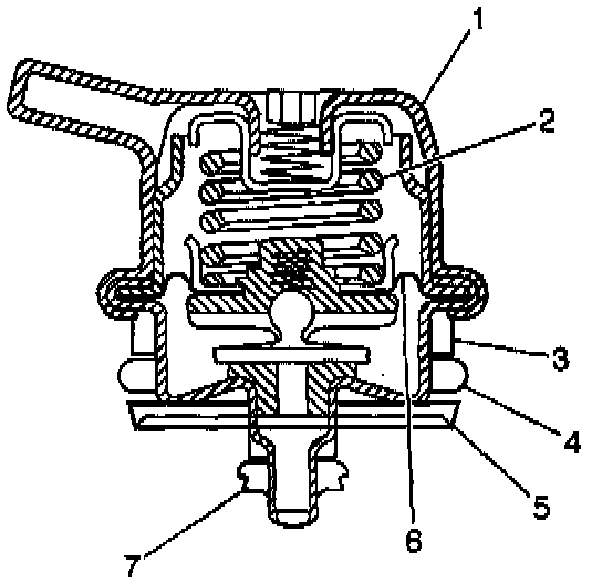 The cartridge type fuel pressure regulator (1) is a diaphragm-operated relief valve (6) with fuel pump pressure on one side, and pressure regulator spring (2), and intake manifold vacuum on the other side. The regulators function is to maintain a constant fuel pressure across the injectors at all times. The pressure regulator compensates for engine load by increasing fuel pressure as engine vacuum drops.
