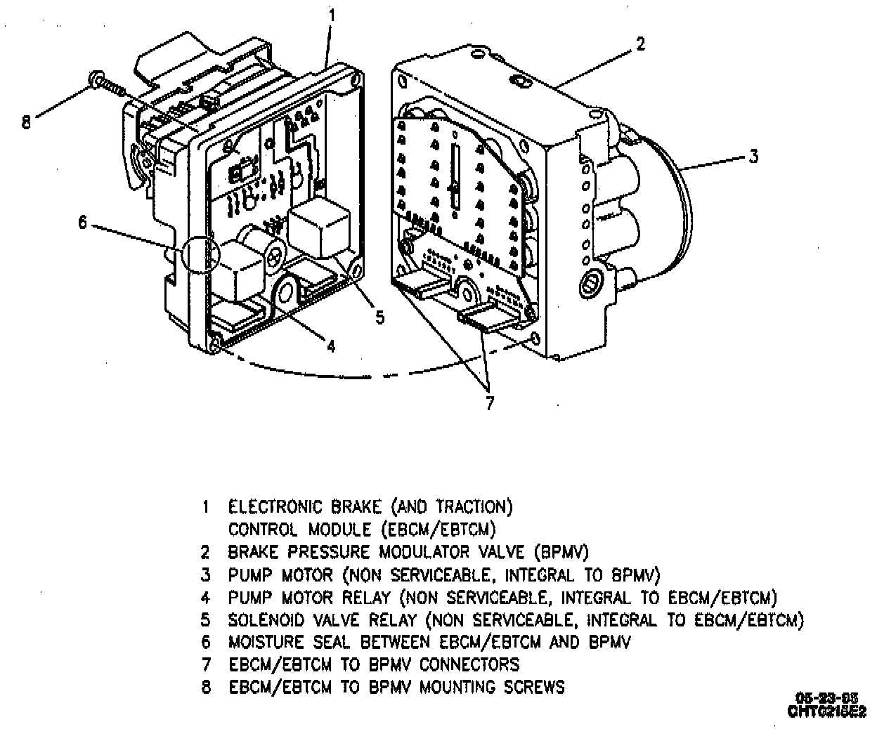 The pump motor relay provides power to the pump motor during "Antilock" braking and "Traction Control." The Solenoid Valve Relay provides power to the solenoid valves in the Brake Pressure Modulator Valve (BPMV). Both of these relays are an integral part of the EBCM/EBTCM and cannot be serviced separately.