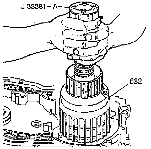 2. Install J 33381-A into the input clutch housing assembly(632).